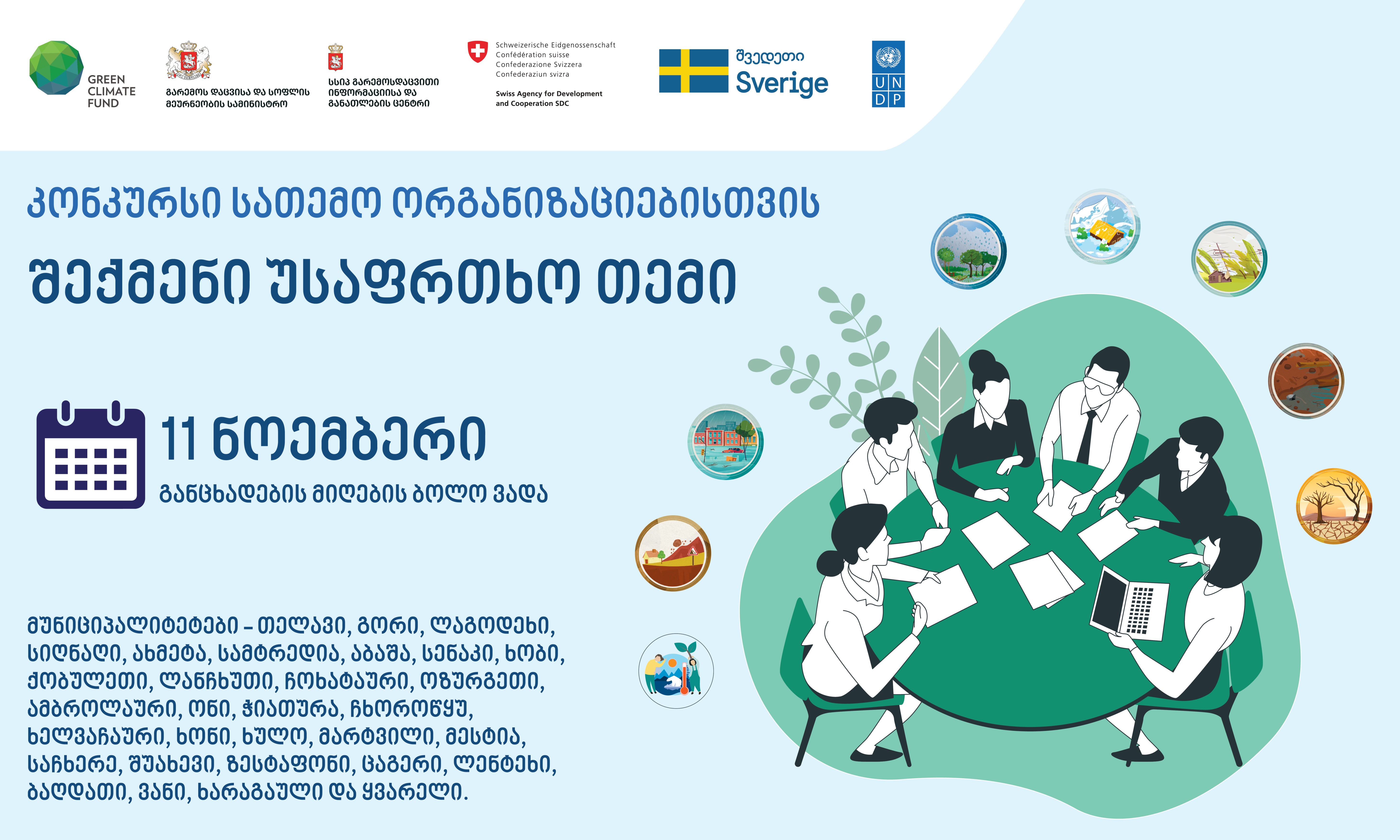 გარემოსდაცვითი ინფორმაციისა და განათლების ცენტრი, გაეროს განვითარების პროგრამის (UNDP) ხელშეწყობით პროექტის - ,,კლიმატის ცვლილებით გამოწვეული კატასტროფების რისკის შემცირება საქართველოში” ფარგლებში აცხადებს კონკურსს სათემო ორგანიზაციებისთვის - ,,შექმენი უსაფრთხო თემი”.