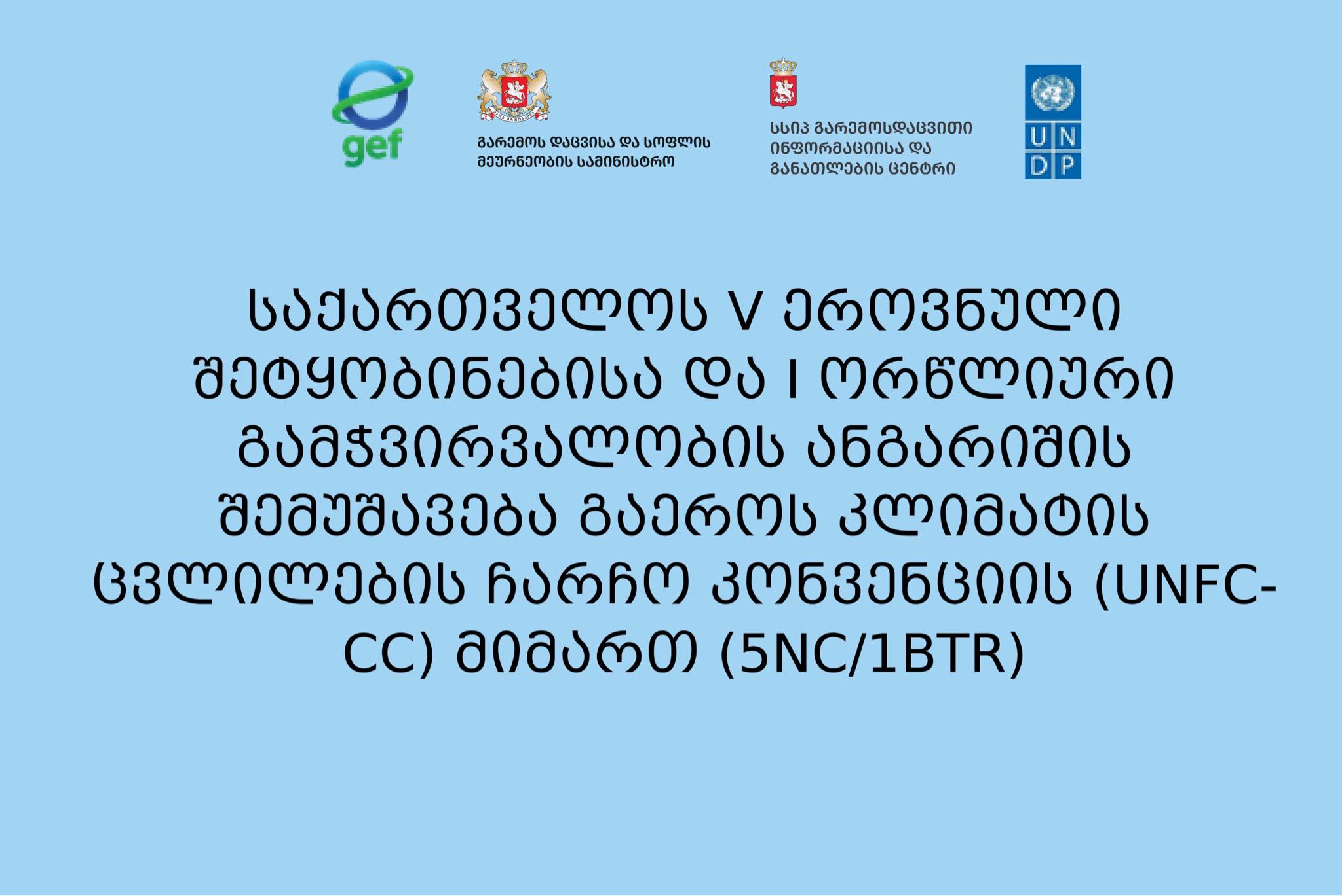 პროექტის მიზანი: საქართველოს მთავრობის მხარდაჭერა კლიმატის ცვლილებასთან დაკავშირებული საკითხების განვითარების სტრატეგიებსა და სექტორული პოლიტიკის დოკუმენტებში გათვალისწინების და ინტეგრაციის პროცესში. პროექტის ამოცანა არის საქართველოს მთავრობის დახმარება მეხუთე ეროვნული შეტყობინების (5NC) და პირველი გამჭვირვალობის ორწლიური ანგარიშის (1BTR) კომბინირებული ანგარიშის ფორმით მომზადების პროცესში, რათა წარუდგინოს UNFCCC-ს, მისი ვალდებულებების შესაბამისად, როგორც განსაზღვრულია ამ კონვენციის მე-4 და მე-12 მუხლების მანდატით და 17/CP.8, 5/CMA.3 და 18/CMA.1 გადაწყვეტილებით.