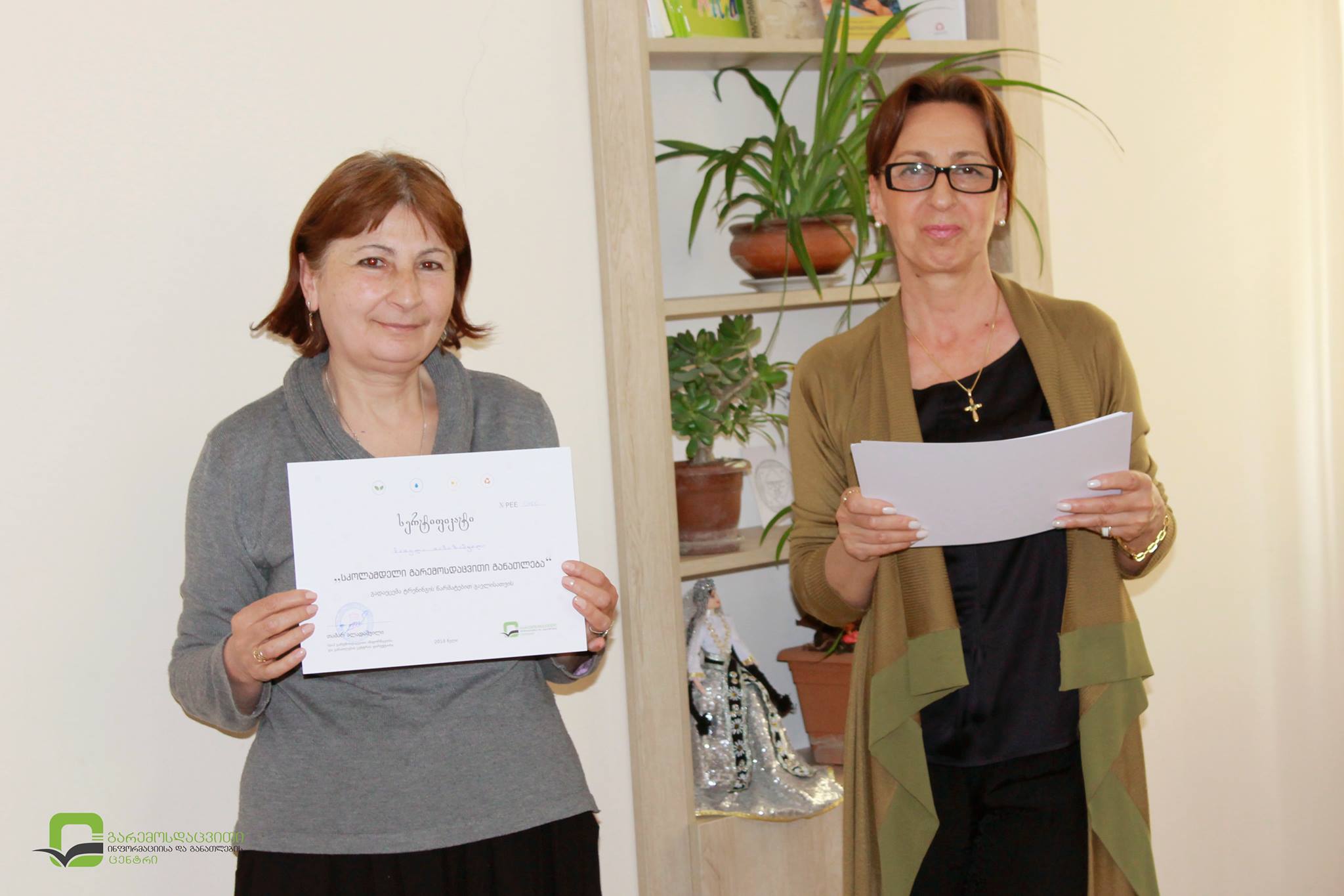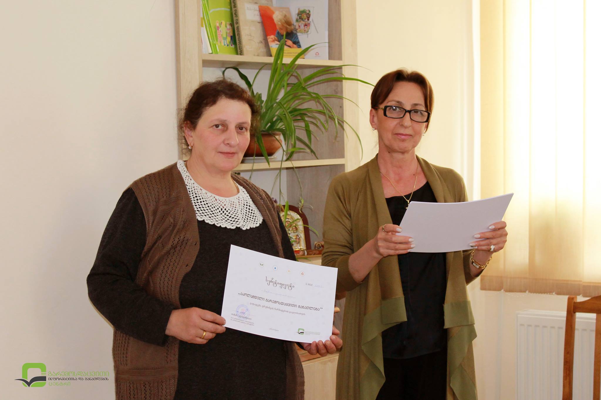 ტრენინგის მონაწილე აღმზრდელებსა და მეთოდისტებს დაურიგდათ სასკოლო მზაობის პროგრამის ფარგლებში, ცენტრის მიერ შემუშავებული სახელმძღვანელო აღმზრდელთათვის - ,,სკოლამდელი გარემოსდაცვითი განათლება“ და გადაეცათ სერტიფიკატები.