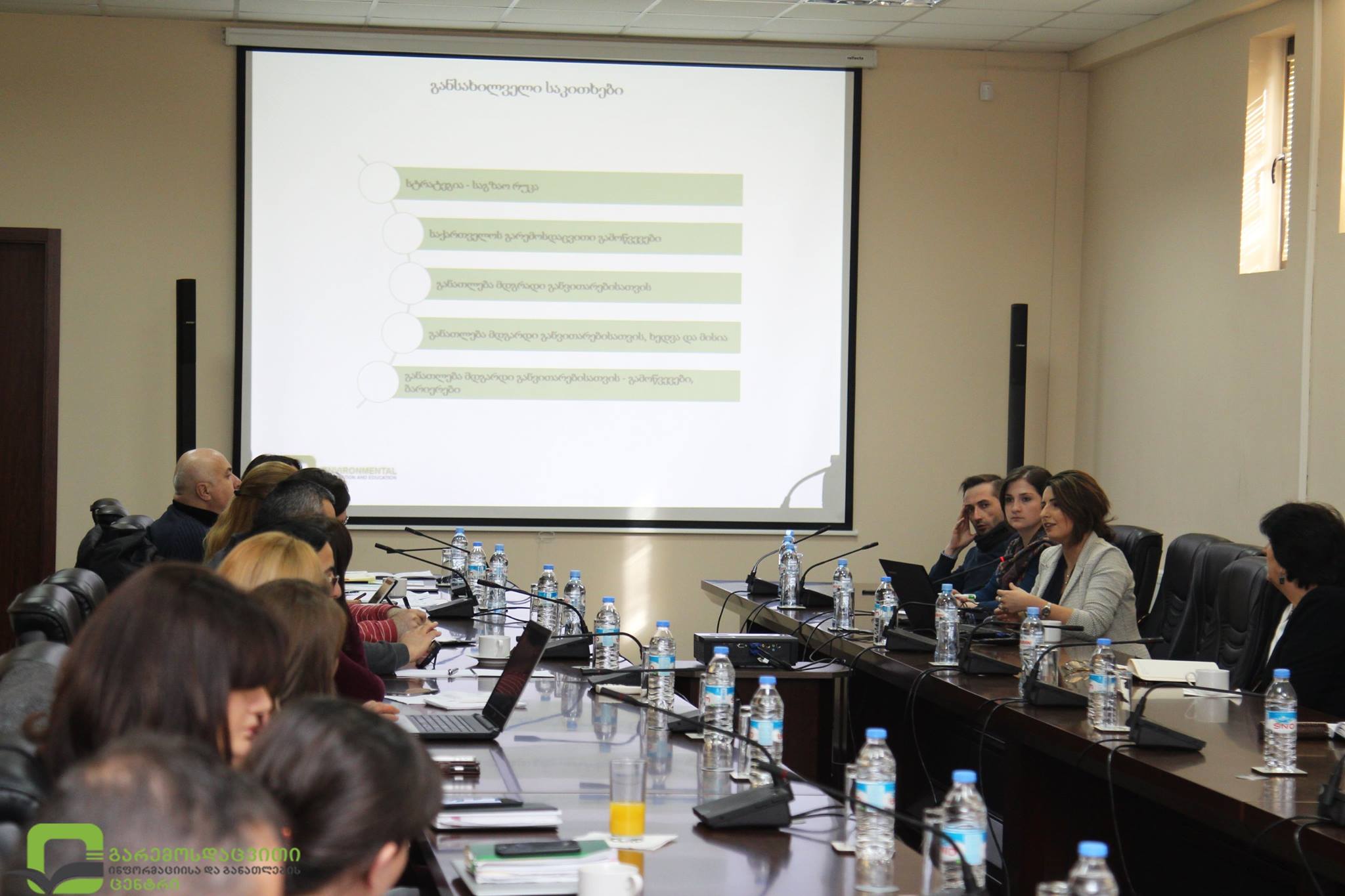 გარემოსდაცვითი ინფორმაციისა და განათლების ცენტრში აღნიშნულ საკითხთან დაკავშირებით სახელმწიფოს სხვადასხვა სტრუქტურის, არასამთავრობო ორგანიზაციებისა და საგანმანათლებლო დაწესებულებების წარმომადგენლებთან პირველი სამუშაო შეხვედრა გაიმართა. შეხვედრა გარემოსდაცვითი ინფორმაციისა და განათლების ცენტრის დირექტორმა, ია პაპიაშვილმა გახსნა.