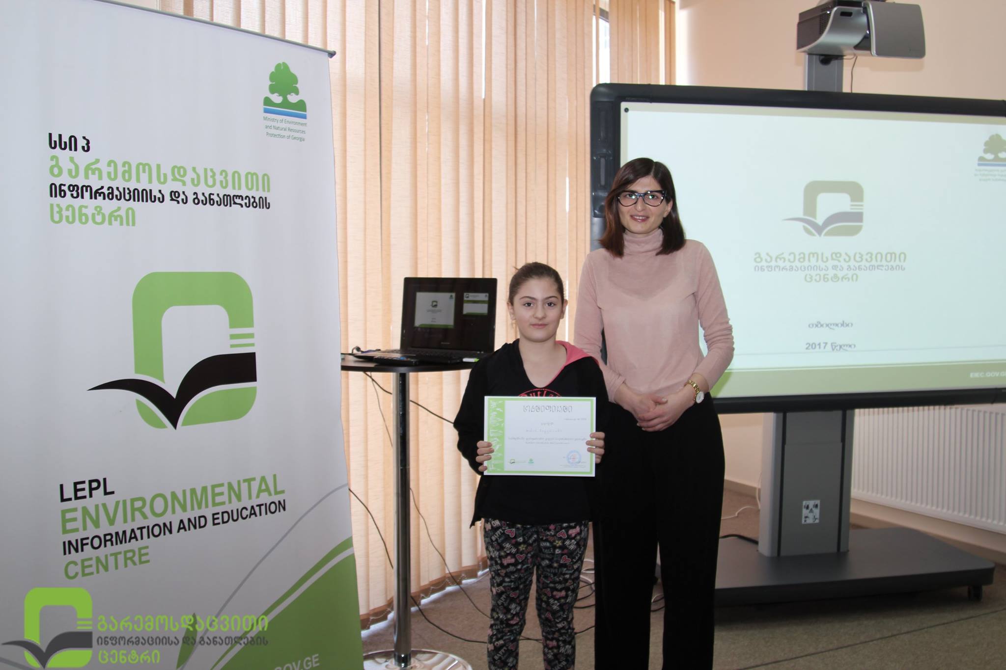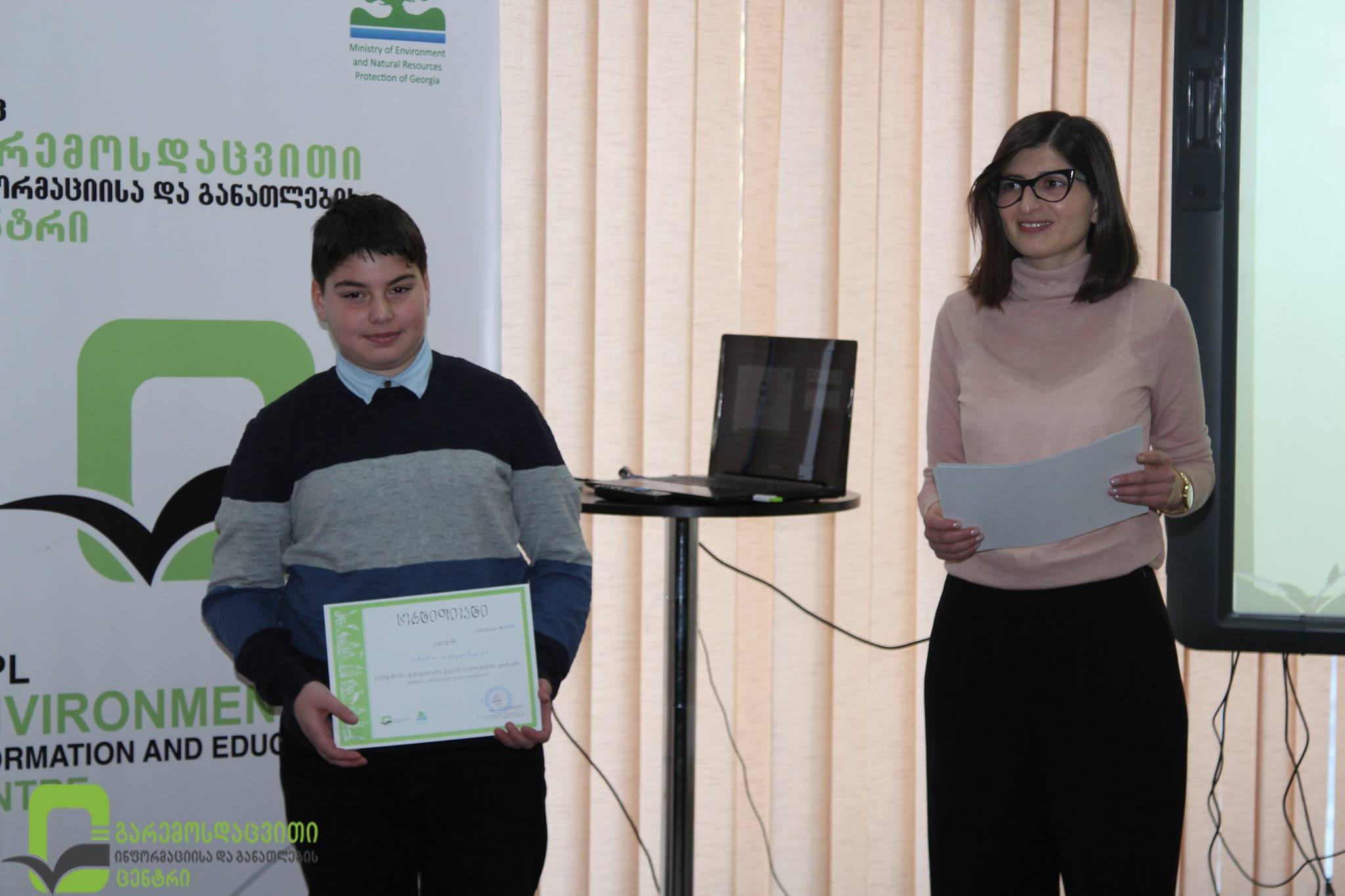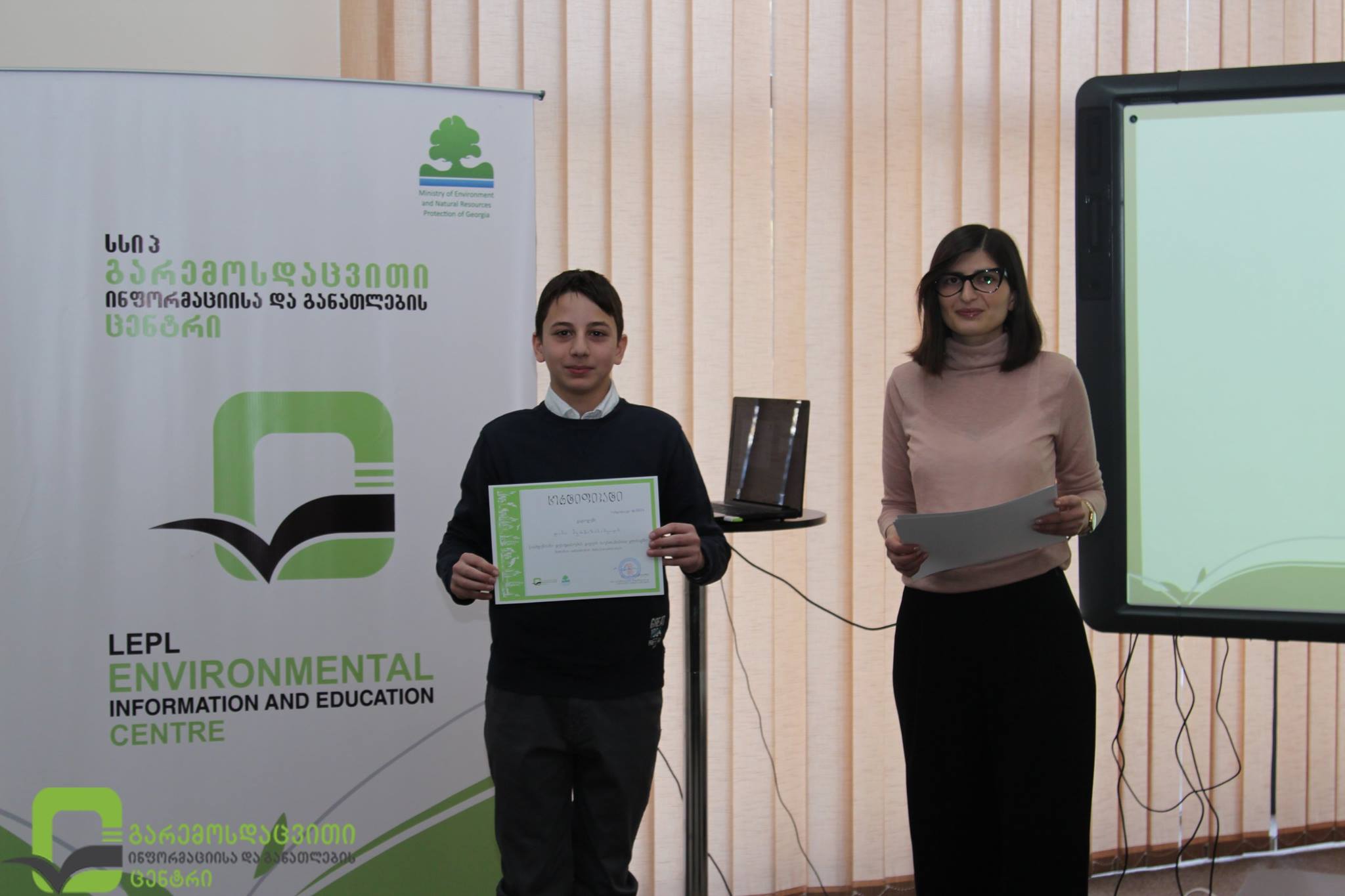 გარემოსდაცვითი ინფორმაციისა და განათლების ცენტრის დირექტორმა, ია პაპიაშვილმა ღონისძიების მონაწილეებს სერტიფიკატები გადასცა. შეხვედრის ბოლოს კი ბავშვებმა დედამიწას თავიანთი დაპირებებიც აღუთქვეს.