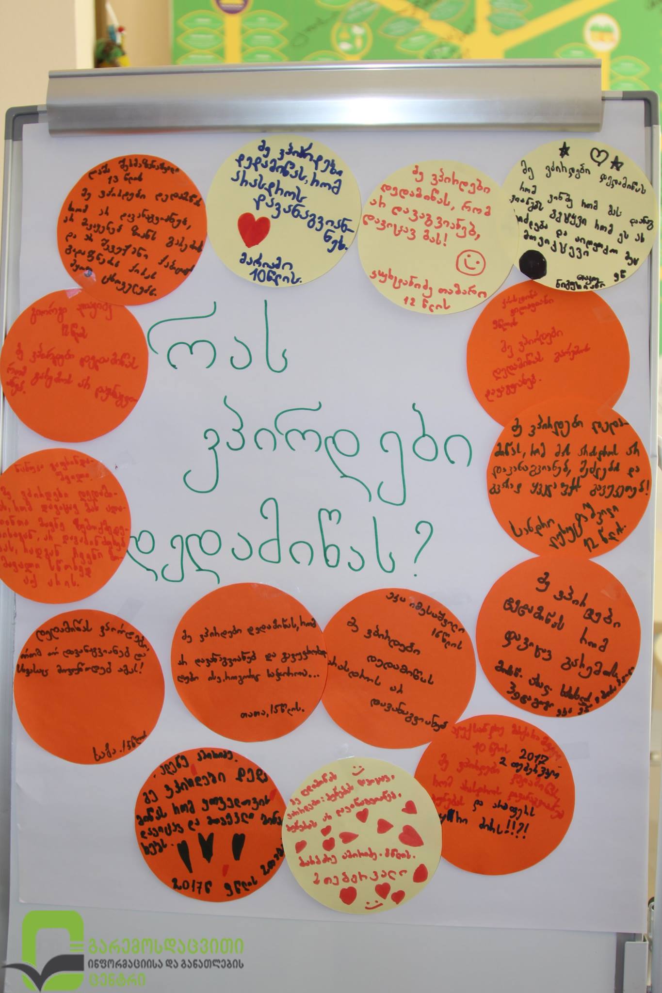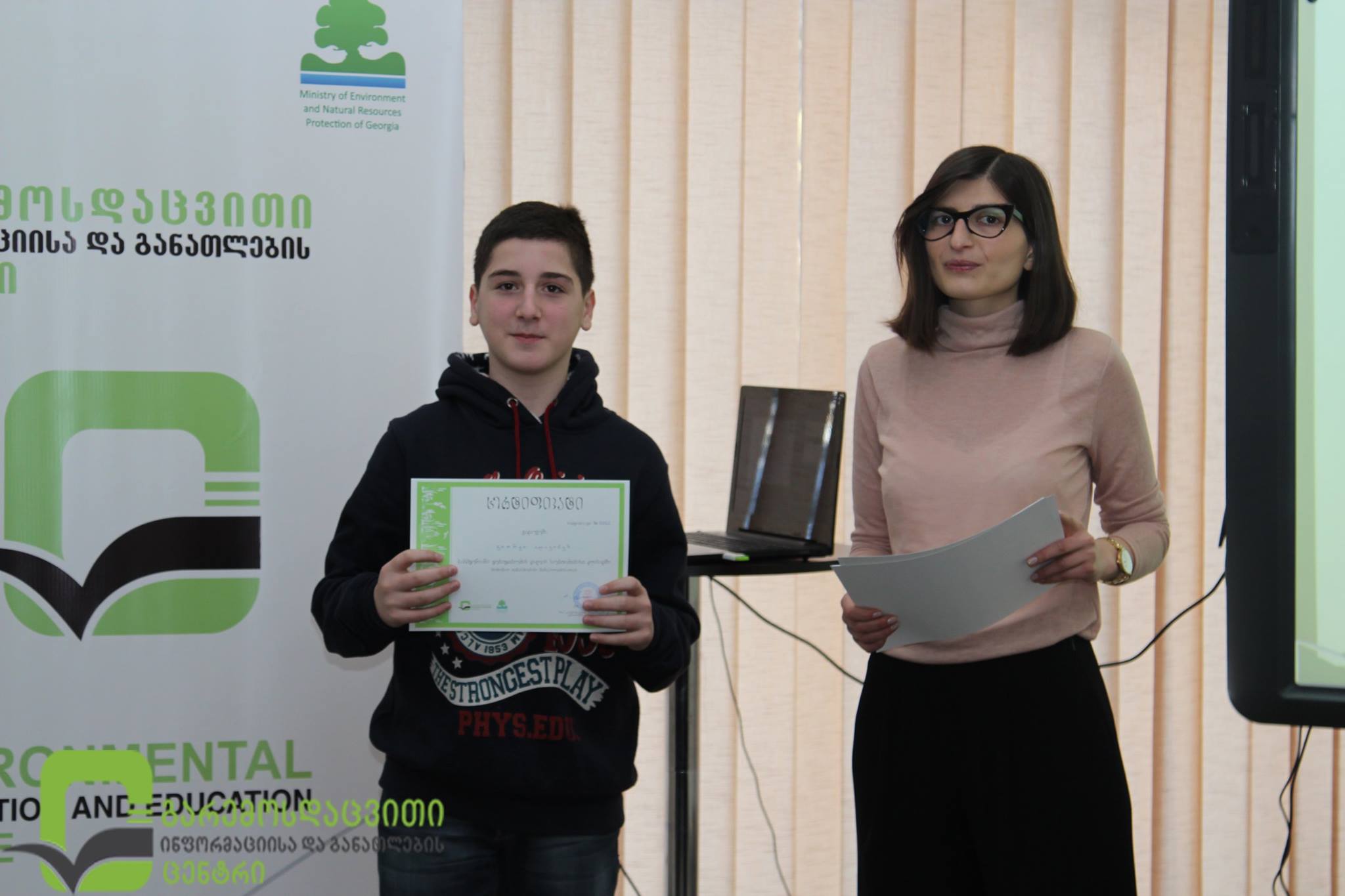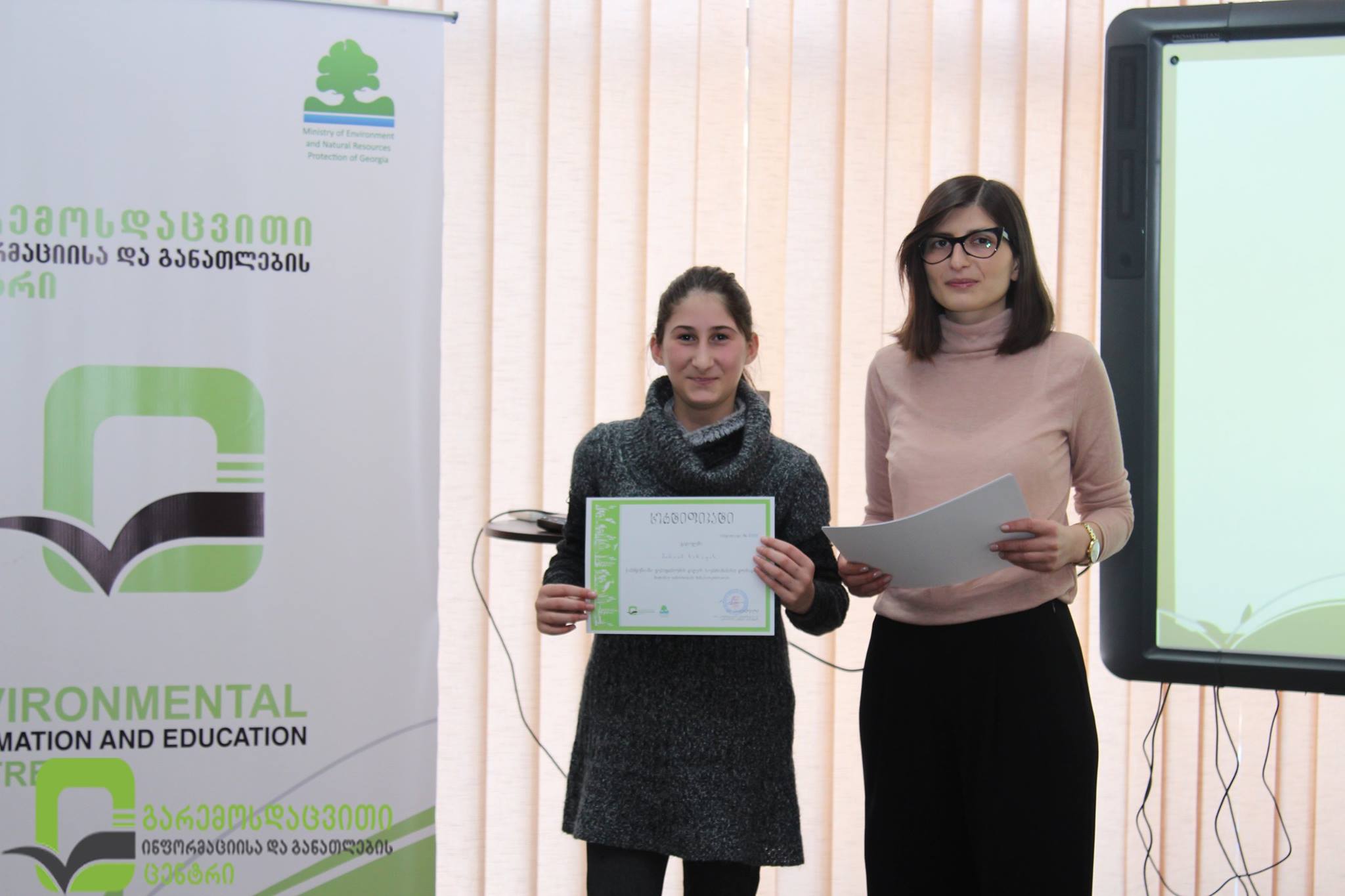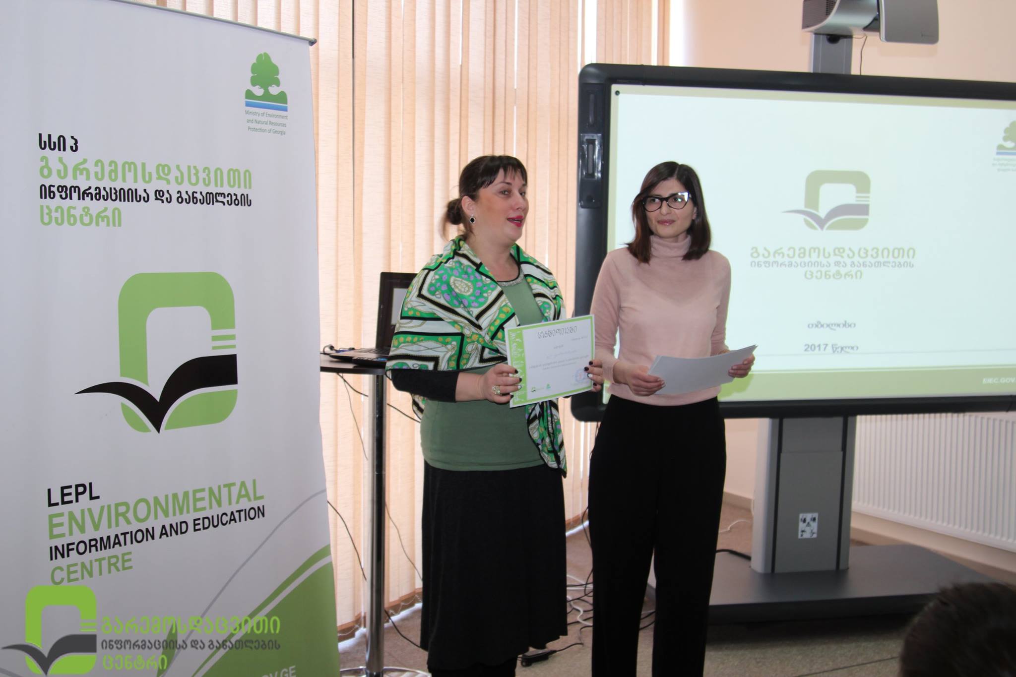 გარემოსდაცვითი ინფორმაციისა და განათლების ცენტრის დირექტორმა, ია პაპიაშვილმა ღონისძიების მონაწილეებს სერტიფიკატები გადასცა. შეხვედრის ბოლოს კი ბავშვებმა დედამიწას თავიანთი დაპირებებიც აღუთქვეს.
