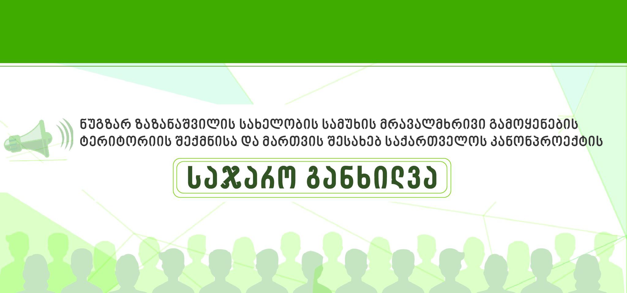 2022 წლის 28 იანვარს, 15:00 საათზე, ნუგზარ ზაზანაშვილის სახელობის სამუხის მრავალმხრივი გამოყენების ტერიტორიის შექმნისა და მართვის შესახებ საქართველოს კანონპროექტის საჯარო განხილვა გაიმართება.