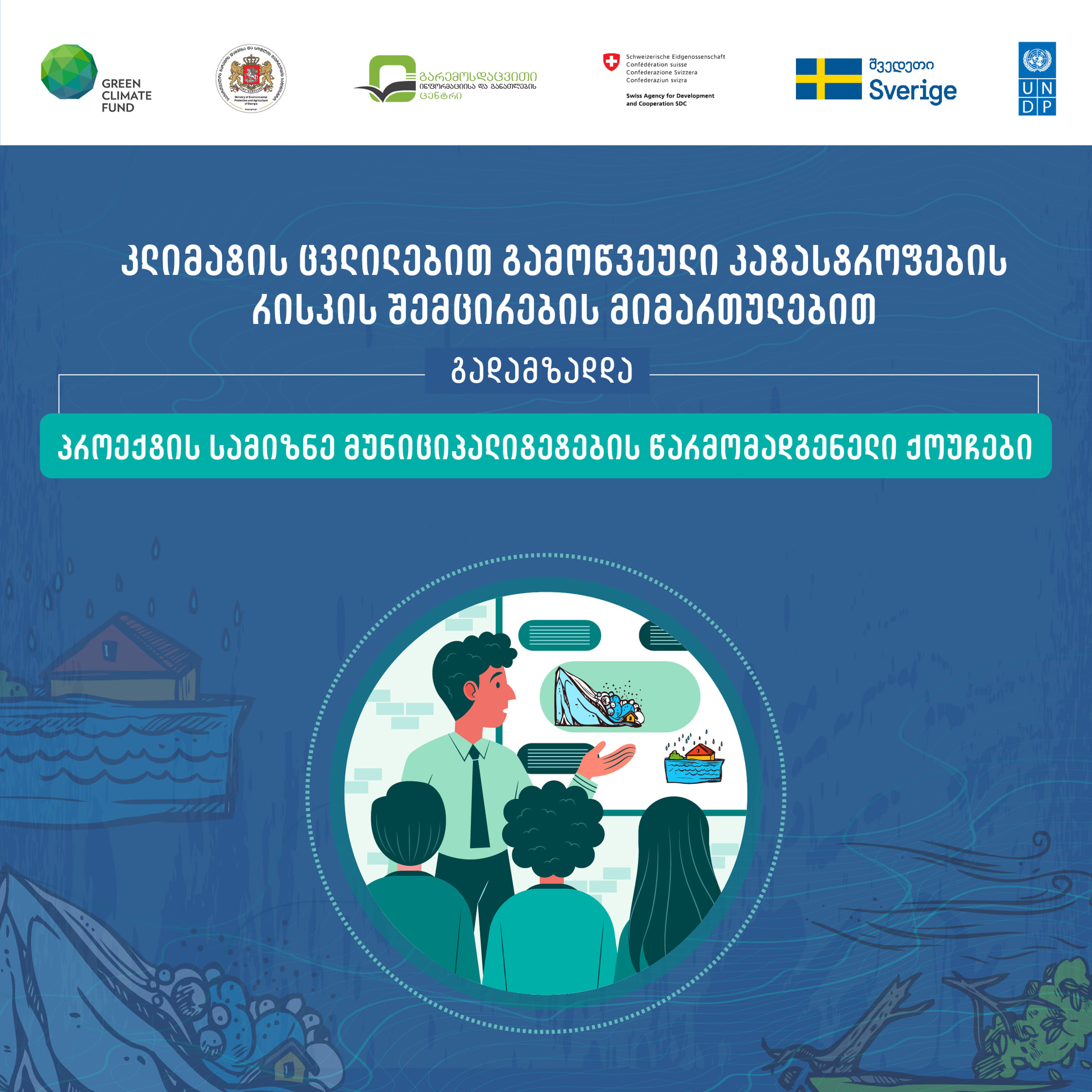 პროგრამა “კლიმატის ცვლილებით გამოწვეული კატასტროფების რისკის შემცირება საქართველოში“ კლიმატის მწვანე ფონდის (GCF),საქართველოს და შვედეთის მთავრობების, შვეიცარიის განვითარებისა და თანამშრომლობის სააგენტოს (SDC) დაფინანსებით და გაეროს განვითარების პროგრამის (UNDP) მხარდაჭერით მიმდინარეობის. პროექტის საგანმანათლებლო და ცნობიერების ამაღლების კომპონენტს გარემოს დაცვისა და სოფლის მეურნეობის სამინისტროს გარემოსდაცვითი ინფორმაციისა და განათლების ცენტრი ახორციელებს.