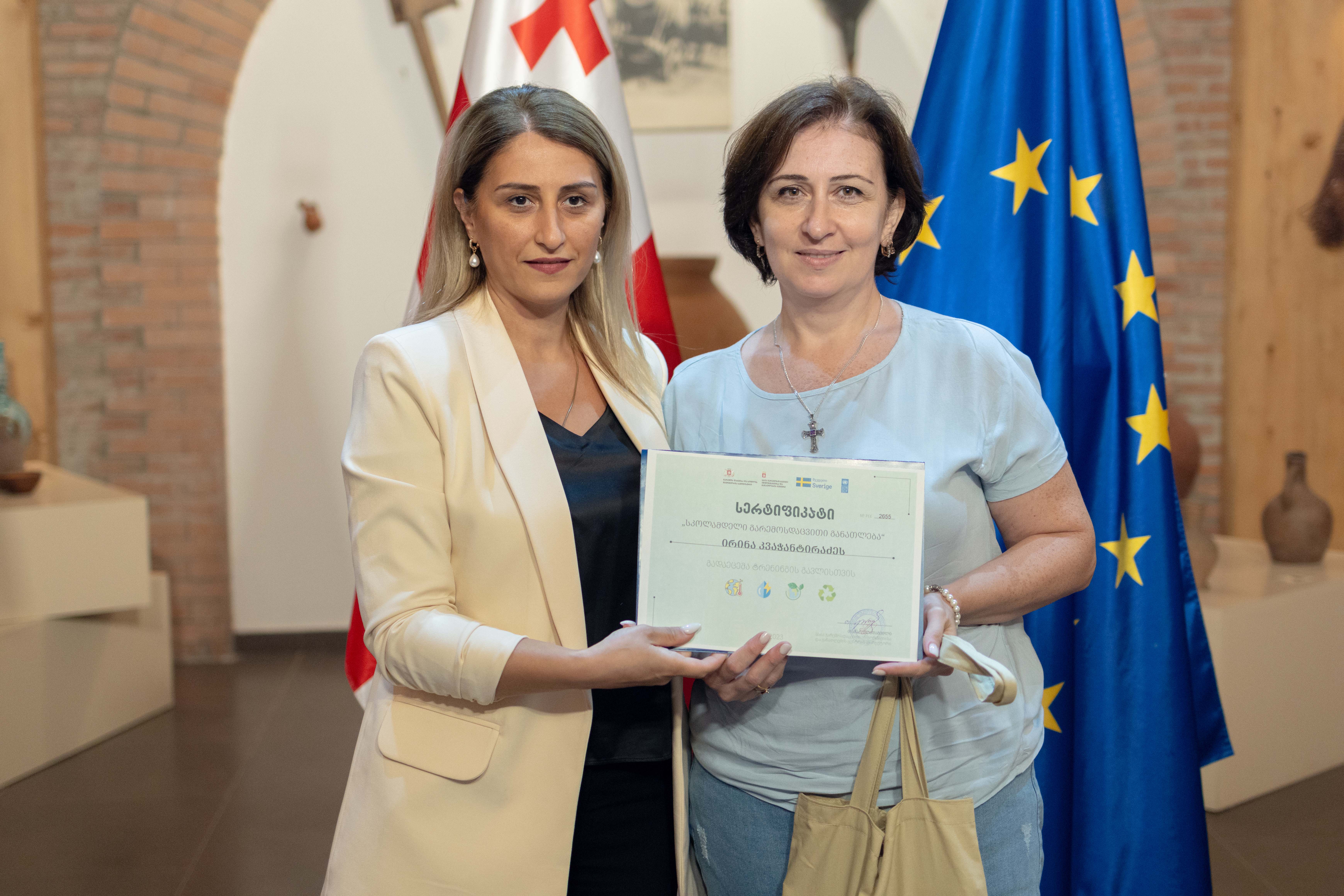 ატმოსფერული ჰაერის ხარისხი და კლიმატის ცვლილება ის მნიშვნელოვანი თემებია, რომლის შესახებაც ტრენინგები გაიარეს სკოლამდელი აღზრდის დაწესებულებების წარმომადგენლებმა. შეხვედრაზე გარემოსდაცვითი ინფორმაციისა და განათლების ცენტრის დირექტორმა თამარ ალადაშვილმა გადამზადებულ სკოლამდელი აღზრდის დაწესებულებების აღმზრდელებსა და მეთოდისტებს სერტიფიკატები და დამხმარე სახელმძღვანელო - „სკოლამდელი გარემოსდაცვითი განათლება“ შესაბამის საგანმანათლებლო რესურსებთან ერთად გადასცა.