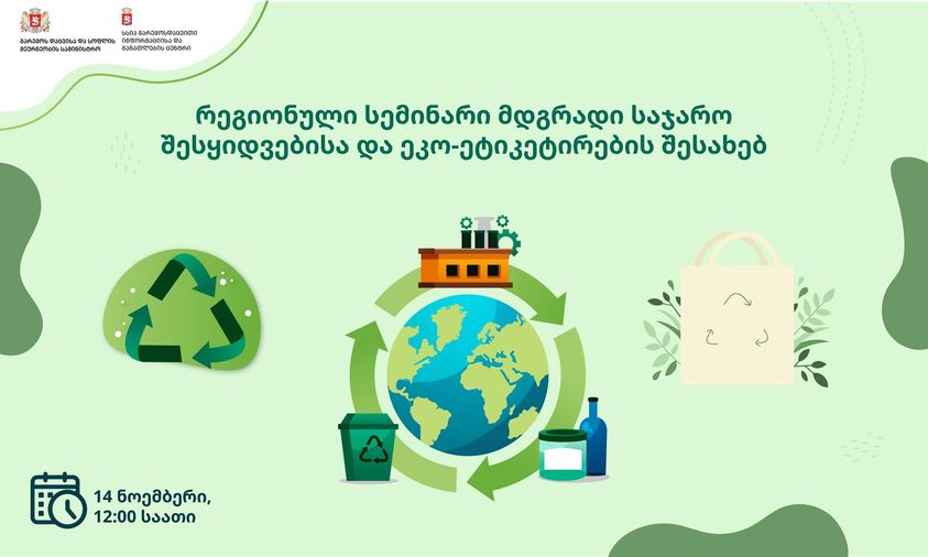 2023 წლის 14 ნოემბერს, 12:00 საათზე გაიმართება ონლაინ სემინარი მდგრადი საჯარო შესყიდვების და ეკოეტიკეტირების შესახებ.