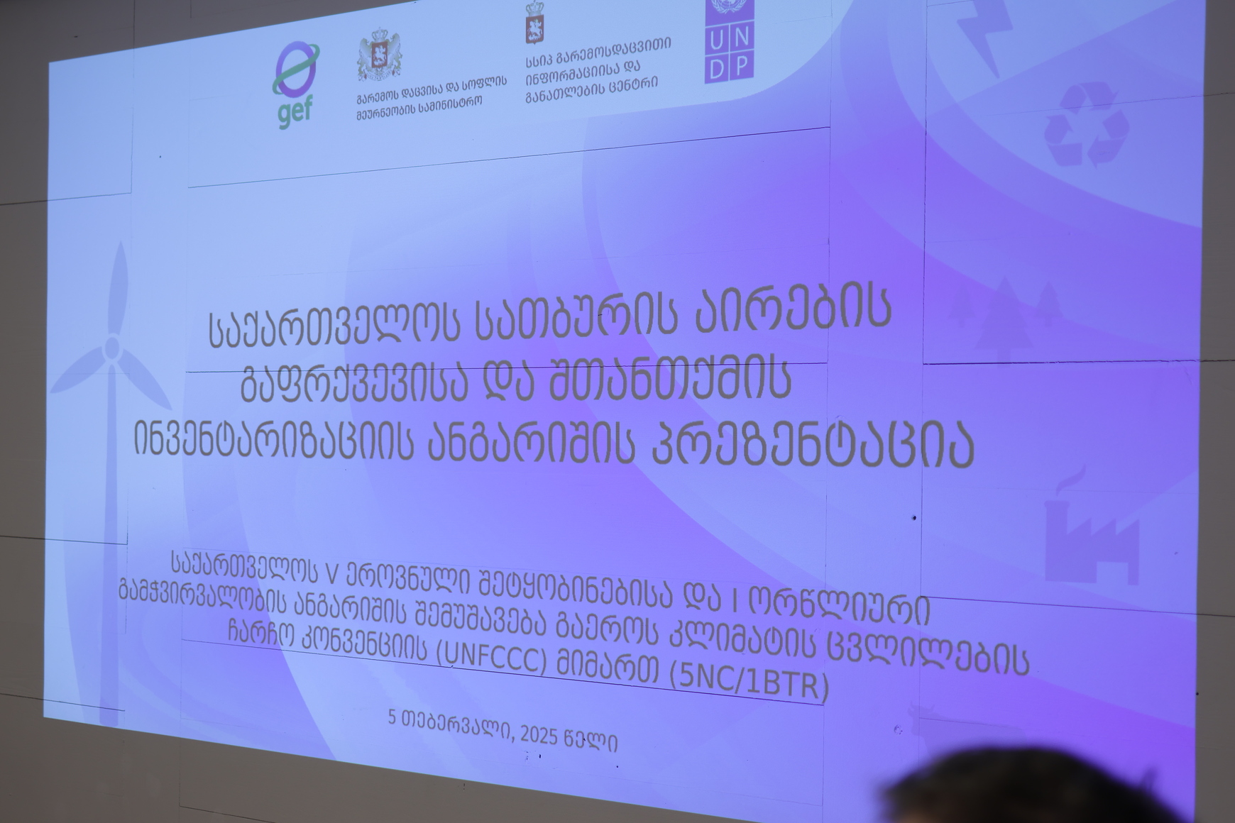 პროექტი „საქართველოს V ეროვნული შეტყობინებისა და I ორწლიური გამჭვირვალობის ანგარიშის შემუშავება გაეროს კლიმატის ცვლილების ჩარჩო კონვენციის (UNFCCC) მიმართ“ ხორციელდება გლობალური გარემოსდაცვითი ფონდისა (GEF) და გაეროს განვითარების პროგრამის (UNDP) მხარდაჭერით.