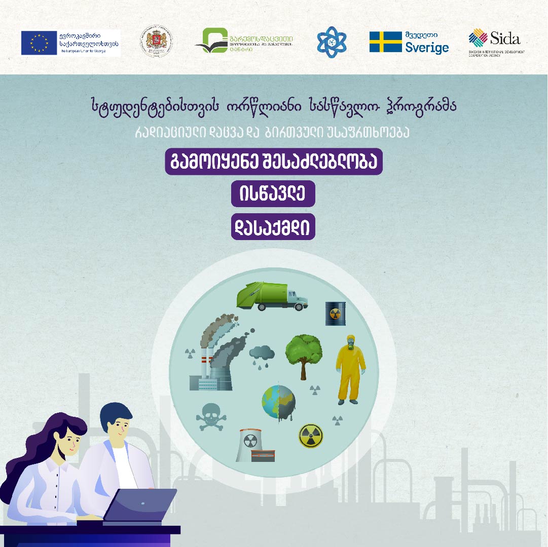 2021-2022 სასწავლო წელს, საქართველოს გარემოს დაცვისა და სოფლის მეურნეობის სამინისტროს სსიპ ბირთვული და რადიაციული უსაფრთხოების სააგენტო, ევროკავშირისა და შვედეთის მთავრობის მხარდაჭერით, აცხადებს მიღებას სტუდენტებისთვის 2 წლიანი გადამზადების პროგრამაზე, რომელიც ითვალისწინებს როგორც თეორიულ, ისე პრაქტიკულ სწავლებას საქართველოსა და უცხოეთში. სასწავლო კურსი სრულად ფინანსდება პროგრამის ფარგლებში. სტუდენტები, რომლებიც წარმატებით გაივლიან აღნიშნულ პროგრამას დასაქმდებიან ბირთვული და რადიაციული უსაფრთხოების სააგენტოს სისტემაში.