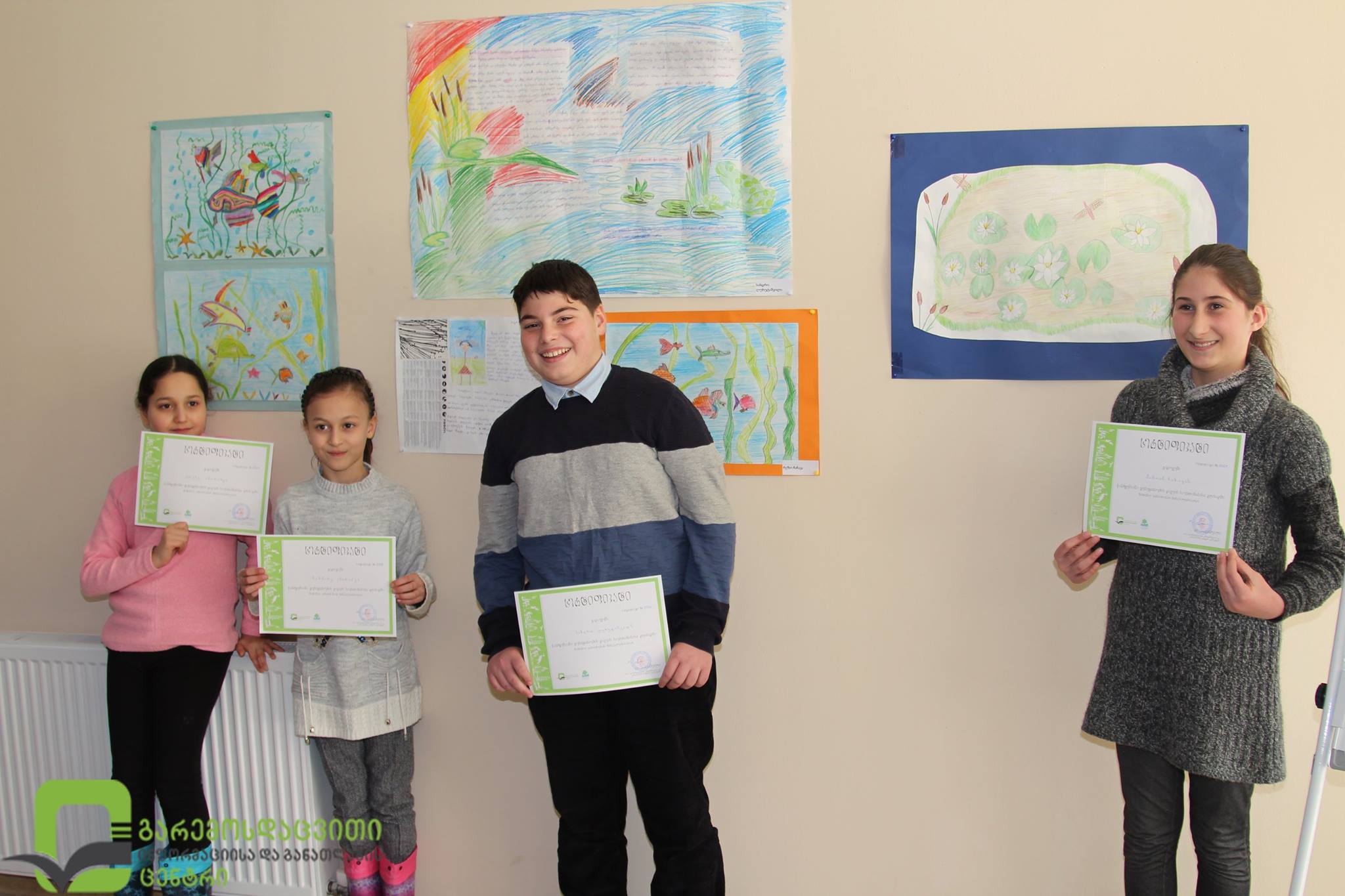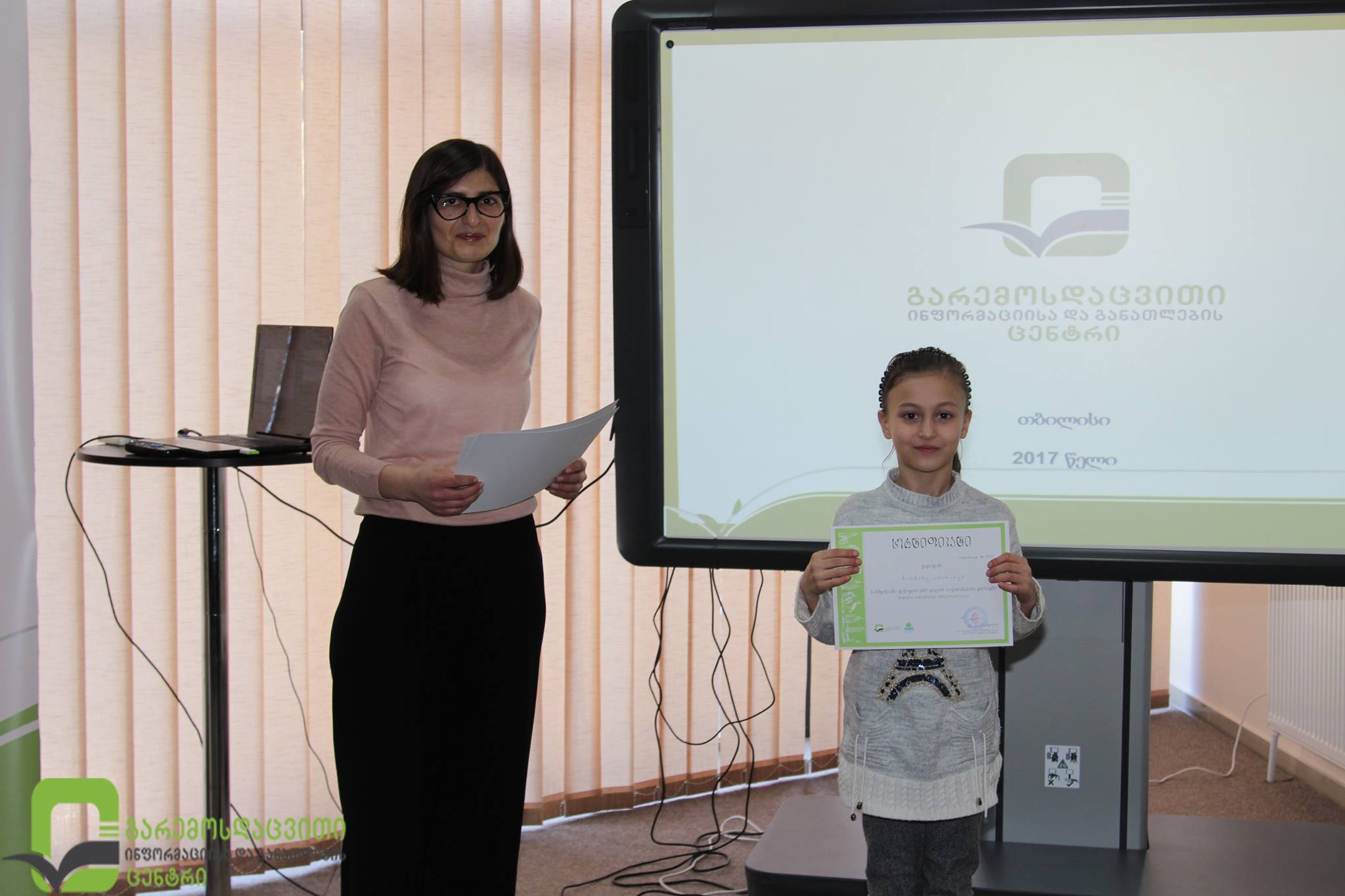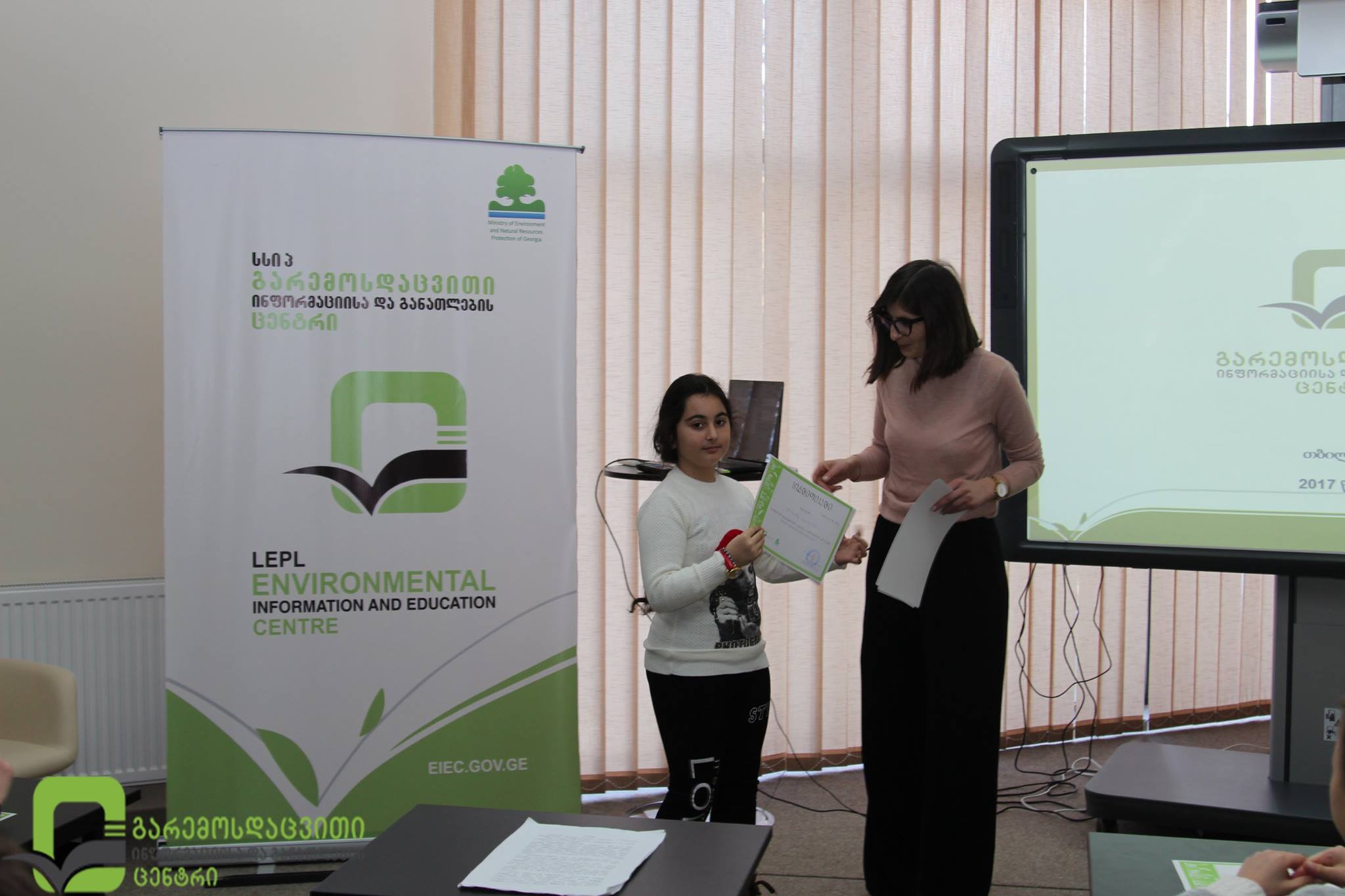 გარემოსდაცვითი ინფორმაციისა და განათლების ცენტრის დირექტორმა, ია პაპიაშვილმა ღონისძიების მონაწილეებს სერტიფიკატები გადასცა. შეხვედრის ბოლოს კი ბავშვებმა დედამიწას თავიანთი დაპირებებიც აღუთქვეს.