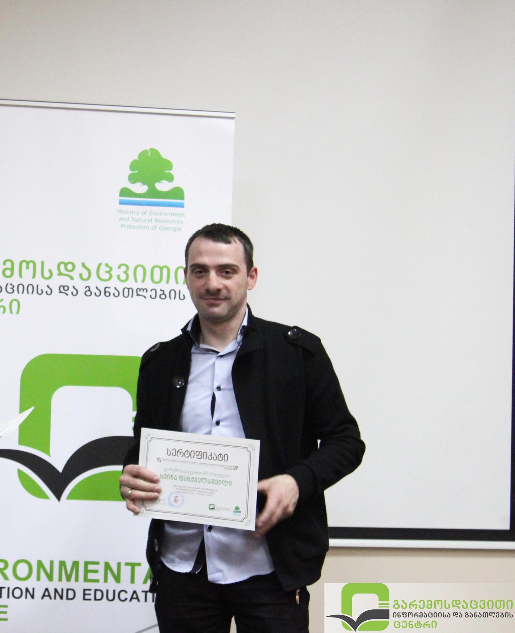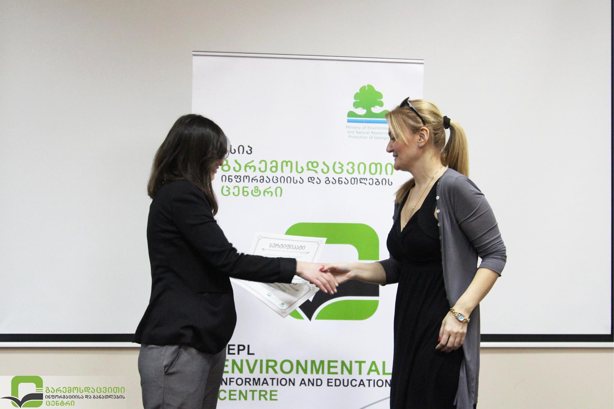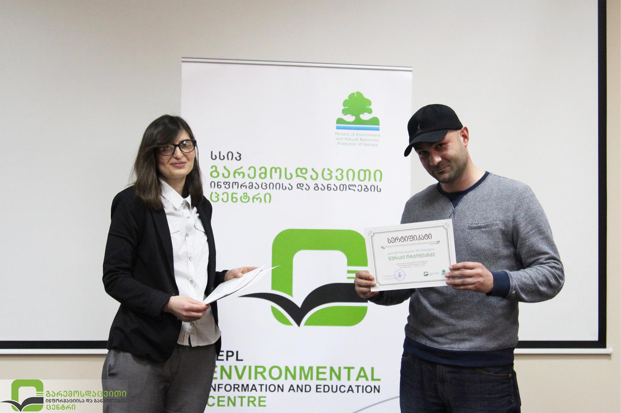სასწავლო კურსის დასრულებისა და ტესტირების წარმატებით გავლის შემდგომ, პროგრამის 30 მონაწილეს სერტიფიკატები ცენტრის დირექტორმა ია პაპიაშვილმა გადასცა. გარემოსდაცვითი ინფორმაციისა და განათლების ცენტრი აგრძელებს მონაწილეების მიღებას სასწავლო კურსზე „გარემოსდაცვითი მმართველი.“