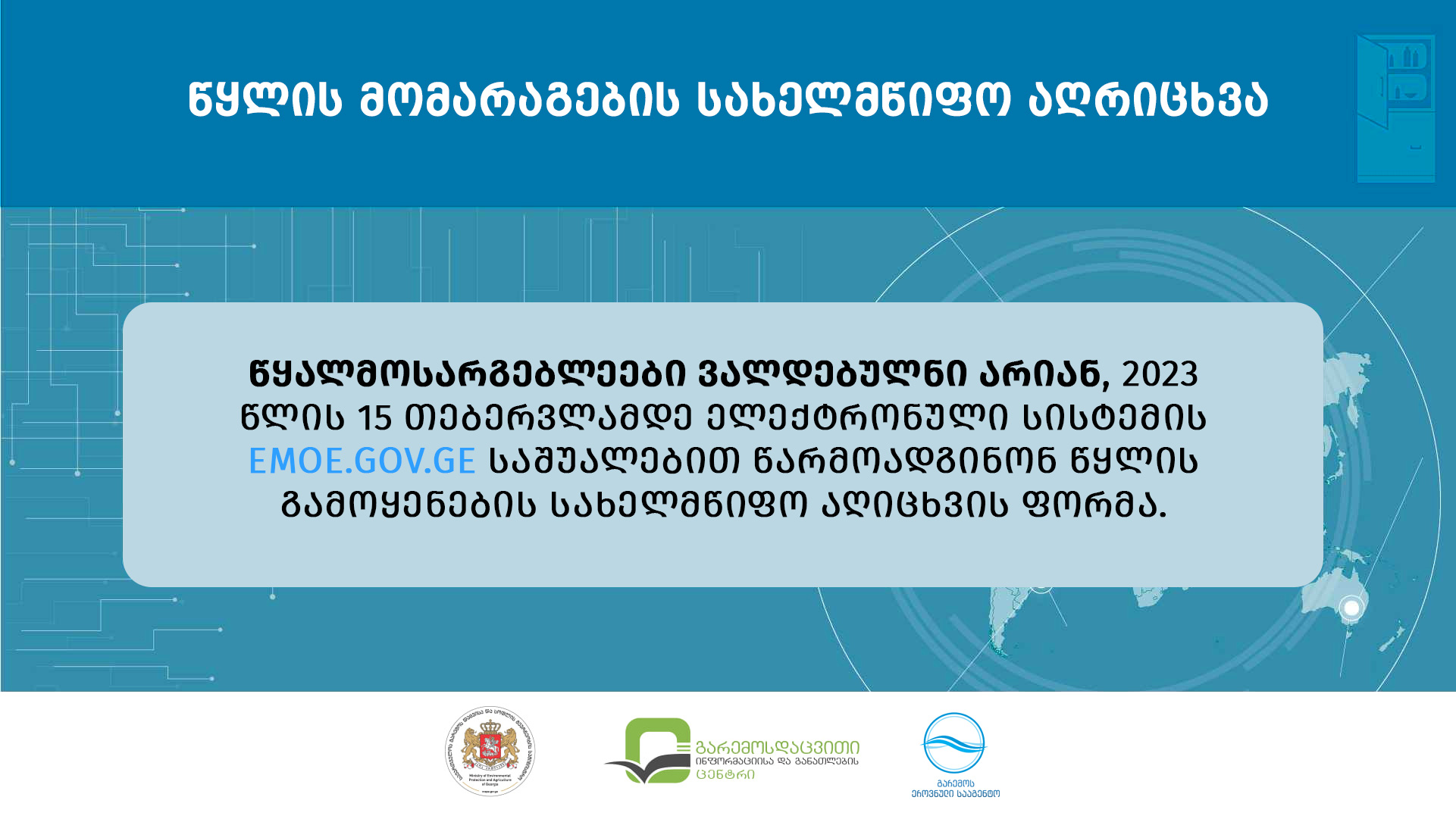 წყლის გამოყენების სახელმწიფო აღრიცხვა ხორციელდება წყლის გამოყენების სახელმწიფო აღრიცხვის ფორმის მიხედვით, რომლებსაც წყალმოსარგებლეები ყოველწლიურად, საანგარიშო წლის დასრულების შემდეგ, არაუგვიანეს 15 თებერვლისა, ელექტრონული სისტემის (https://emoe.gov.ge/) მეშვეობით ავსებენ და წარუდგენენ სსიპ გარემოს ეროვნულ სააგენტოს, ხოლო აფხაზეთისა და აჭარის ავტონომიური რესპუბლიკების ტერიტორიაზე წყალსარგებლობის შემთხვევაში – აფხაზეთისა და აჭარის ავტონომიური რესპუბლიკების გარემოს დაცვისა და ბუნებრივი რესურსების შესაბამის სამსახურებს. სსიპ გარემოს ეროვნული სააგენტო და აფხაზეთისა და აჭარის ავტონომიური რესპუბლიკების გარემოს დაცვისა და ბუნებრივი რესურსების შესაბამისი სამსახურები გადაწყვეტილებას წარდგენილი წყლის გამოყენების სახელმწიფო აღრიცხვის ფორმების დადასტურების თაობაზე იღებენ არაუგვიანეს 1 აპრილისა.