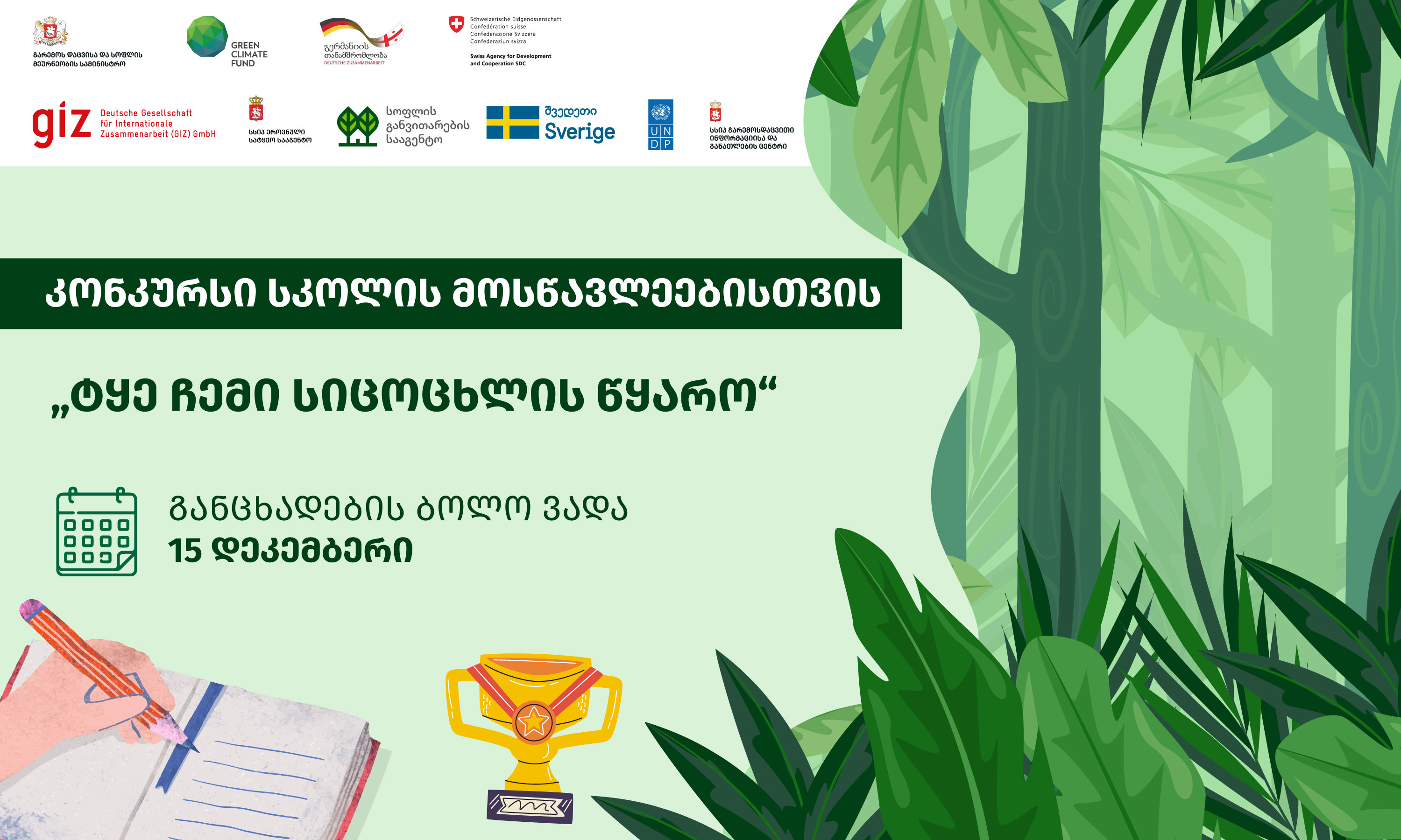 კონკურსის გამოცხადება გარემოს დაცვისა და სოფლის მეურნეობის სამინისტროს სსიპ გარემოსდაცვითი ინფორმაციისა და განათლების ცენტრი სკოლის მოსწავლეებისთვის აცხადებს კონკურსს თემაზე: „ ტყე ჩემი სიცოცხლის წყარო“.