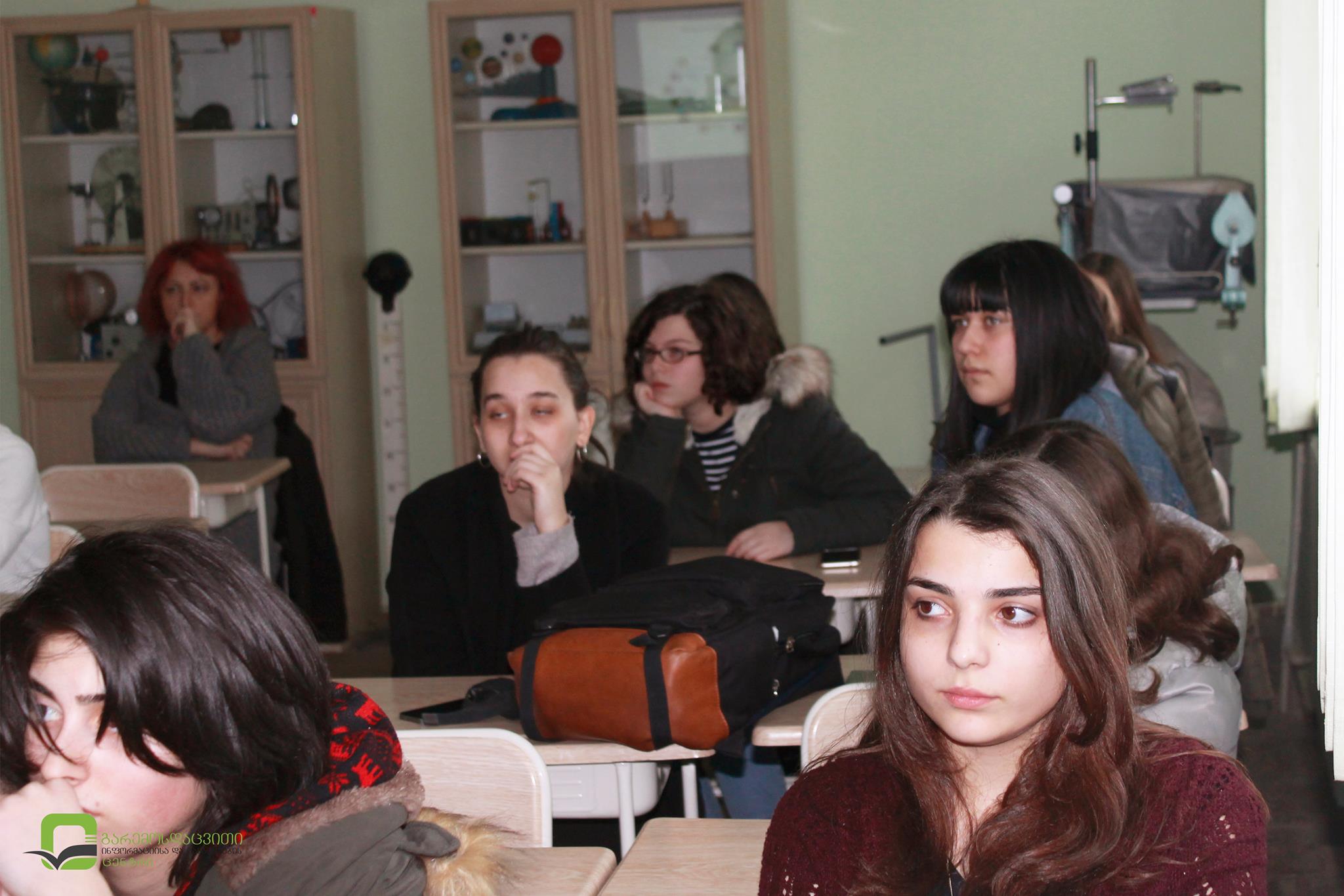 პროექტის ფარგლებში "მდგრადი განვითარება და გარემოს დაცვა" პირველი შეხვედრა 182-ე სკოლის მეათე კლასის მოსწავლეებთან გაიმართა. ლექციის მსვლელობისას მოსწავლეებმა ინფორმაცია მიიიღეს მდგრადი განვითარების კონცეფციის ჩამოყალიბების ისტორიაზე, მის მნიშვნელობასა და მდგრადი განვითარების მიზნებზე. განსაკუთრებული ყურადღება გამახვილდა იმ გარემოსდაცვით პრობლემებზე, რომლებიც მდგრადი განვითარების სხვადასხვა მიზანს უკავშირდება, კერძოდ: ატმოსფერული ჰაერის ხარისხი, წყლის რესურსების დაცვა, ეკოსისტემებისა და ბიომრავალფეროვნების დაცვა და სხვა.. ლექციის დასასრულს, მოსწავლეებს სპეციალური კითხვარი " ჩემი ეკოლოგიური ნაკვალევი" დაურიგდათ, რომლის საშუალებითაც მათ გარემოზე საკუთარი ზეგავლენის გამოთვლა შეეძლებათ.