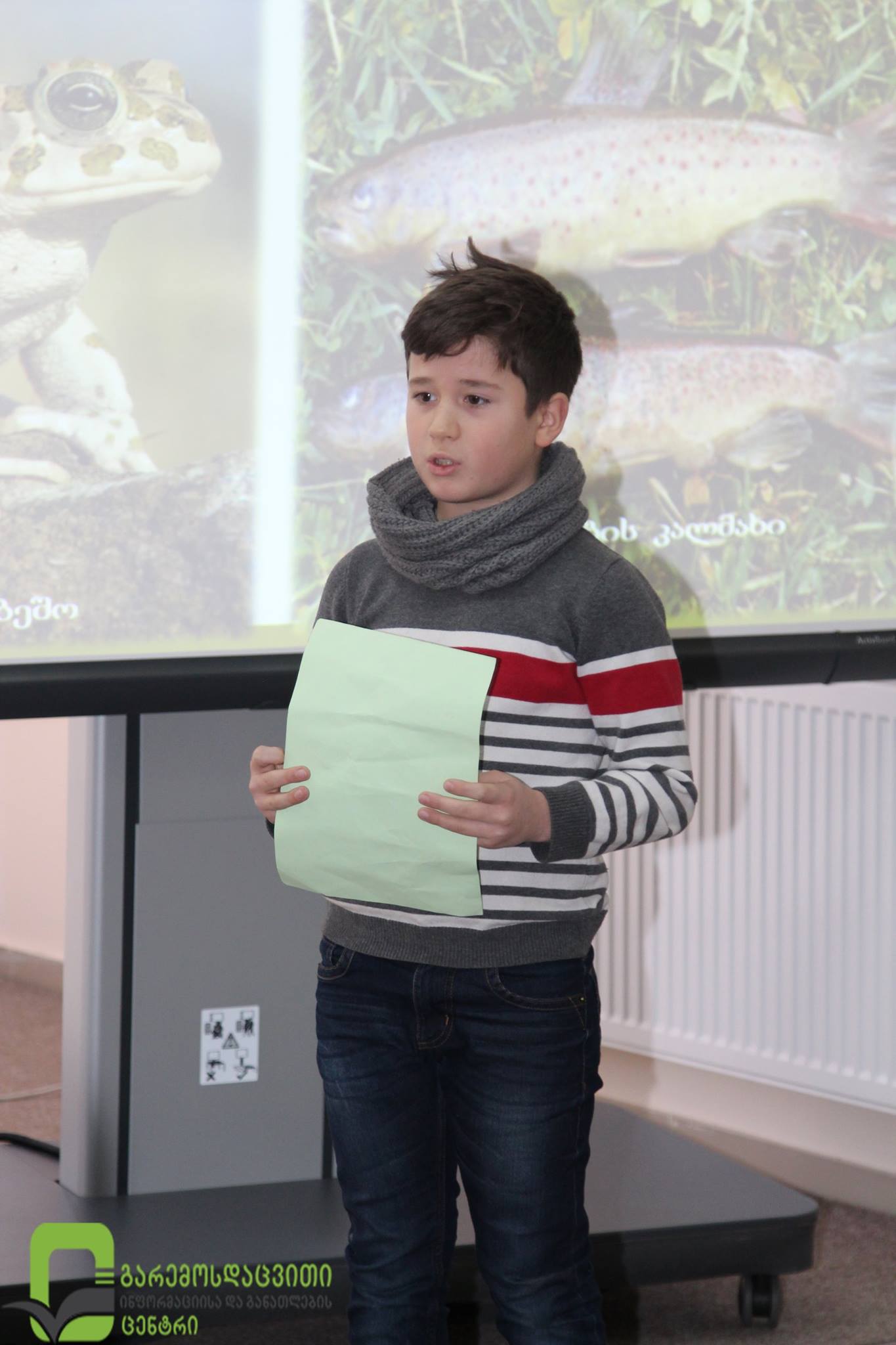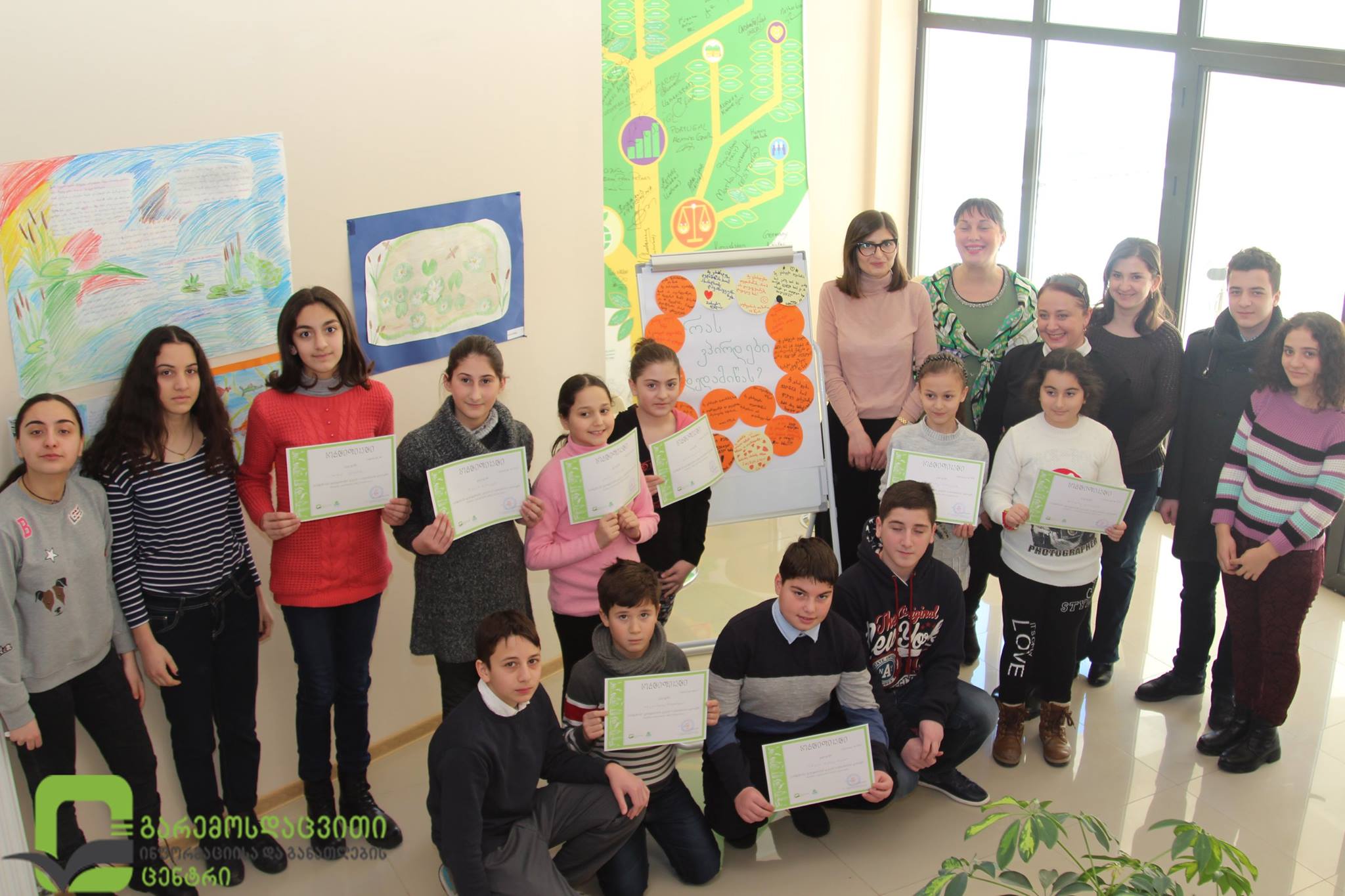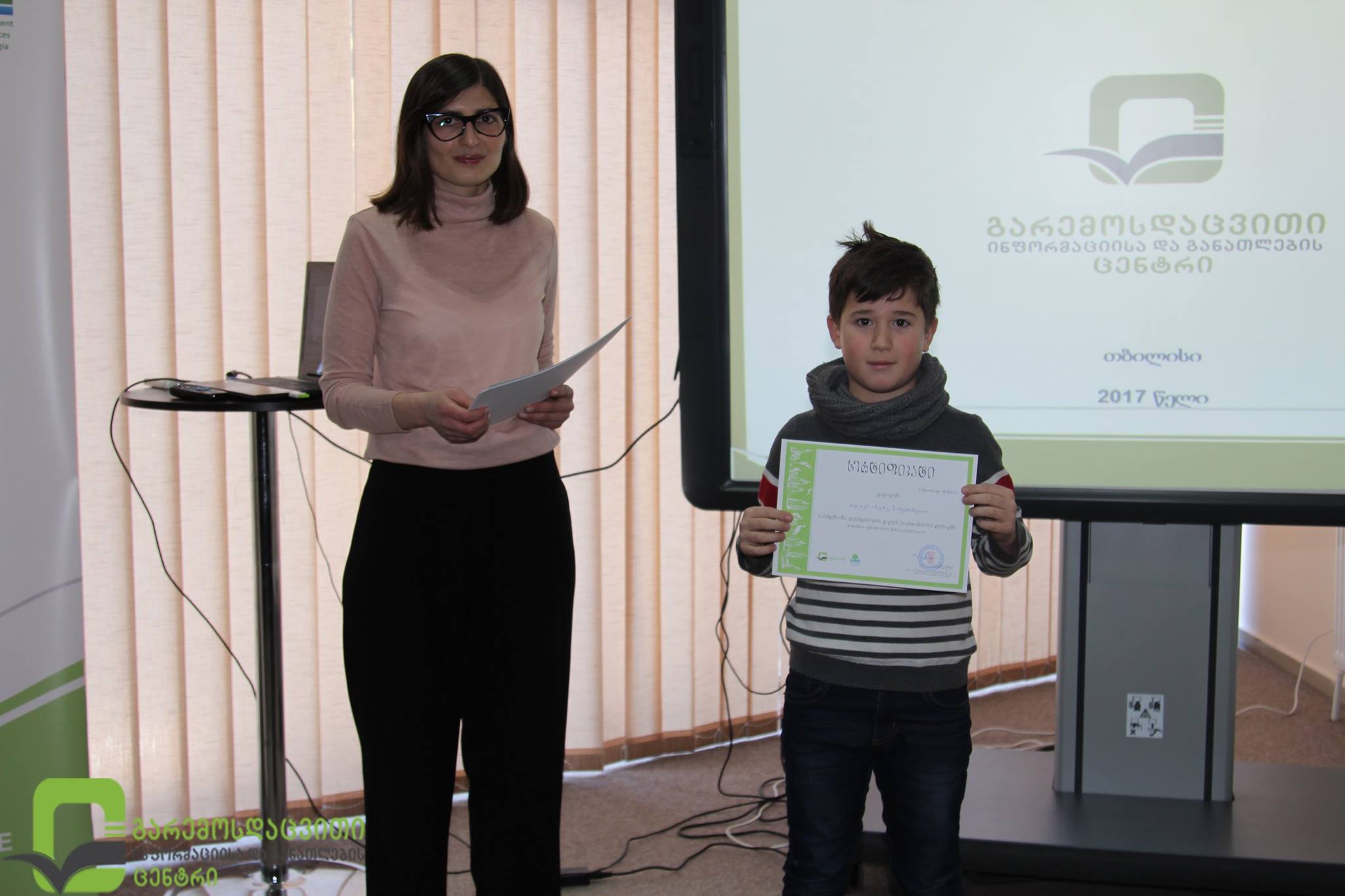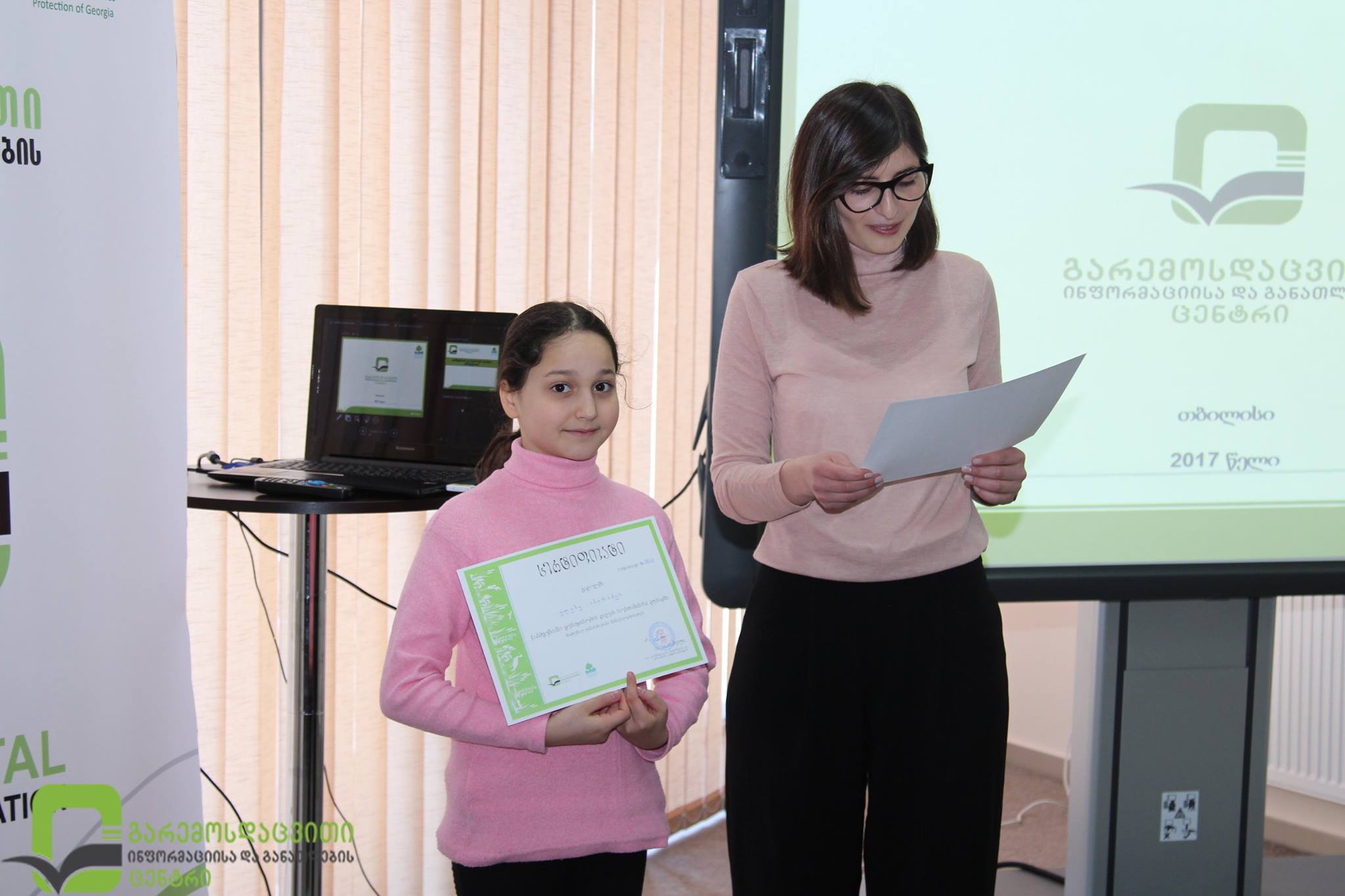 გარემოსდაცვითი ინფორმაციისა და განათლების ცენტრის დირექტორმა, ია პაპიაშვილმა ღონისძიების მონაწილეებს სერტიფიკატები გადასცა. შეხვედრის ბოლოს კი ბავშვებმა დედამიწას თავიანთი დაპირებებიც აღუთქვეს.