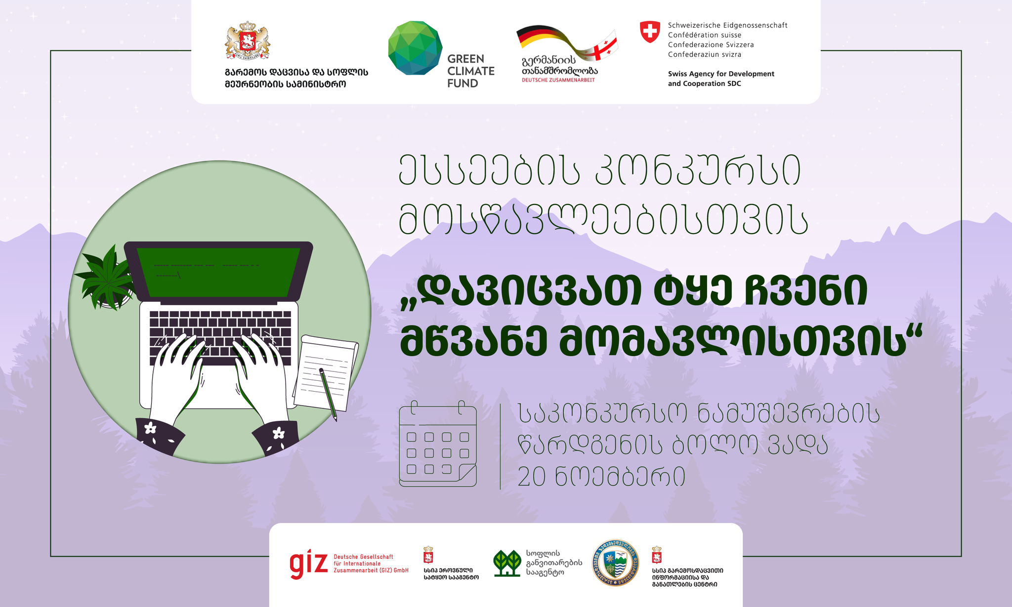 გარემოსდაცვითი ინფორმაციისა და განათლების ცენტრი აცხადებს ესსეების კონკურსს სკოლის მოსწავლეებისათვის „დავიცვათ ტყე ჩვენი მწვანე მომავლისთვის“.
