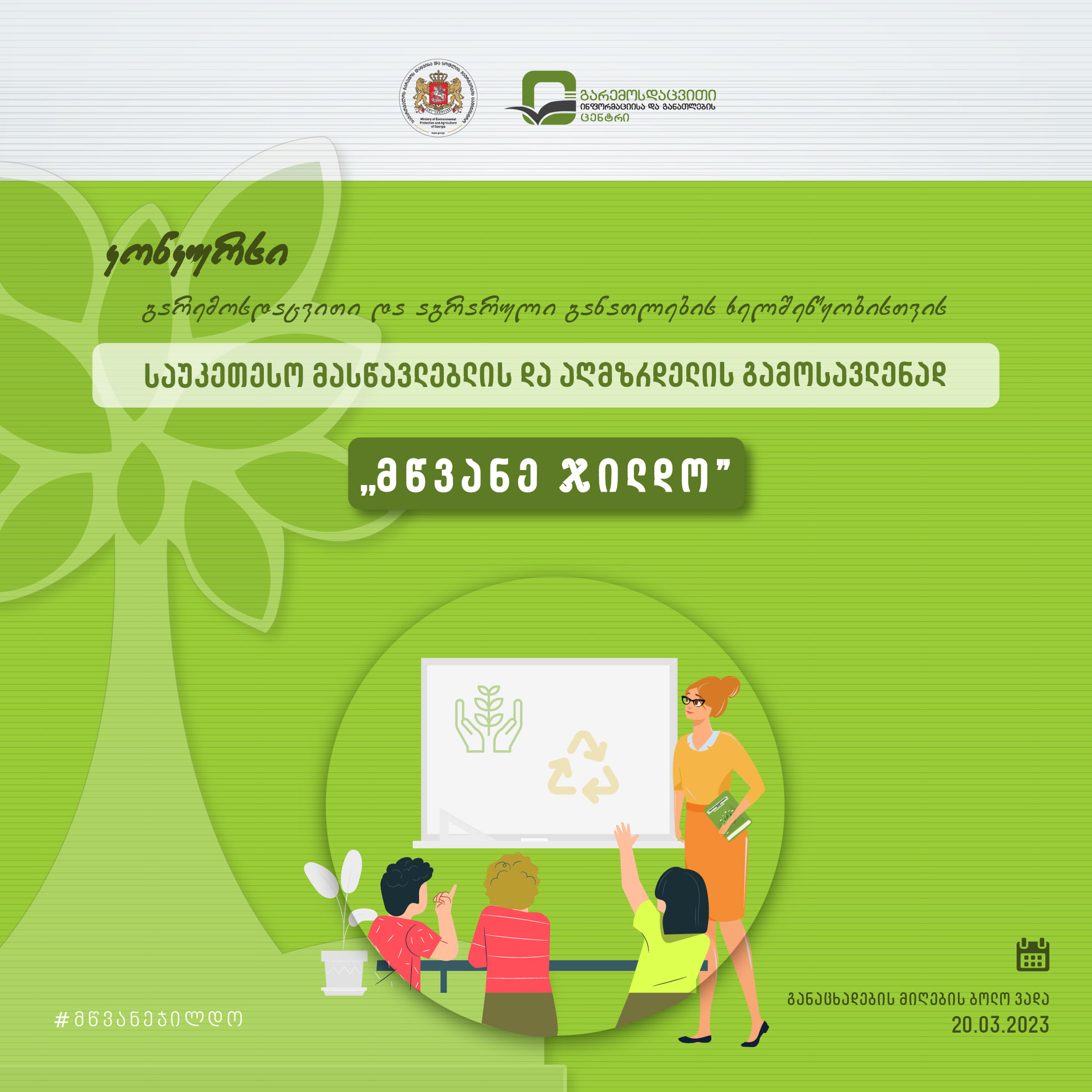 გარემოსდაცვითი ინფორმაციისა და განათლების ცენტრი აცხადებს “მწვანე ჯილდოს” კონკურსს 2022-2023 სასწავლო წლის საუკეთესო აღმზრდელის/მეთოდისტის და დაწყებითი საფეხურის (1-6 კლასი) მასწავლებლების გამოსავლენად მთელი საქართველოს მასშტაბით.