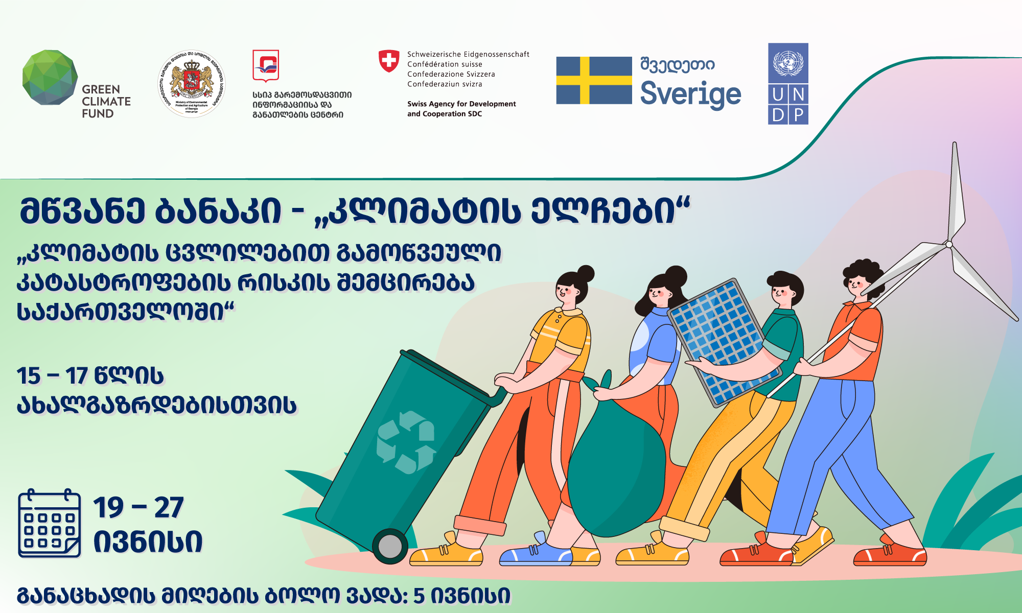 გარემოსდაცვითი ინფორმაციისა და განათლების ცენტრი პროექტის - „კლიმატის ცვლილებით გამოწვეული კატასტროფების რისკის შემცირება საქართველოში“ ფარგლებში აცხადებს მწვანე ბანაკის- „კლიმატის ელჩები“ მონაწილეების შერჩევას, რომელიც გაიმართება 19 - 27 ივნისს, ბაკურიანში.