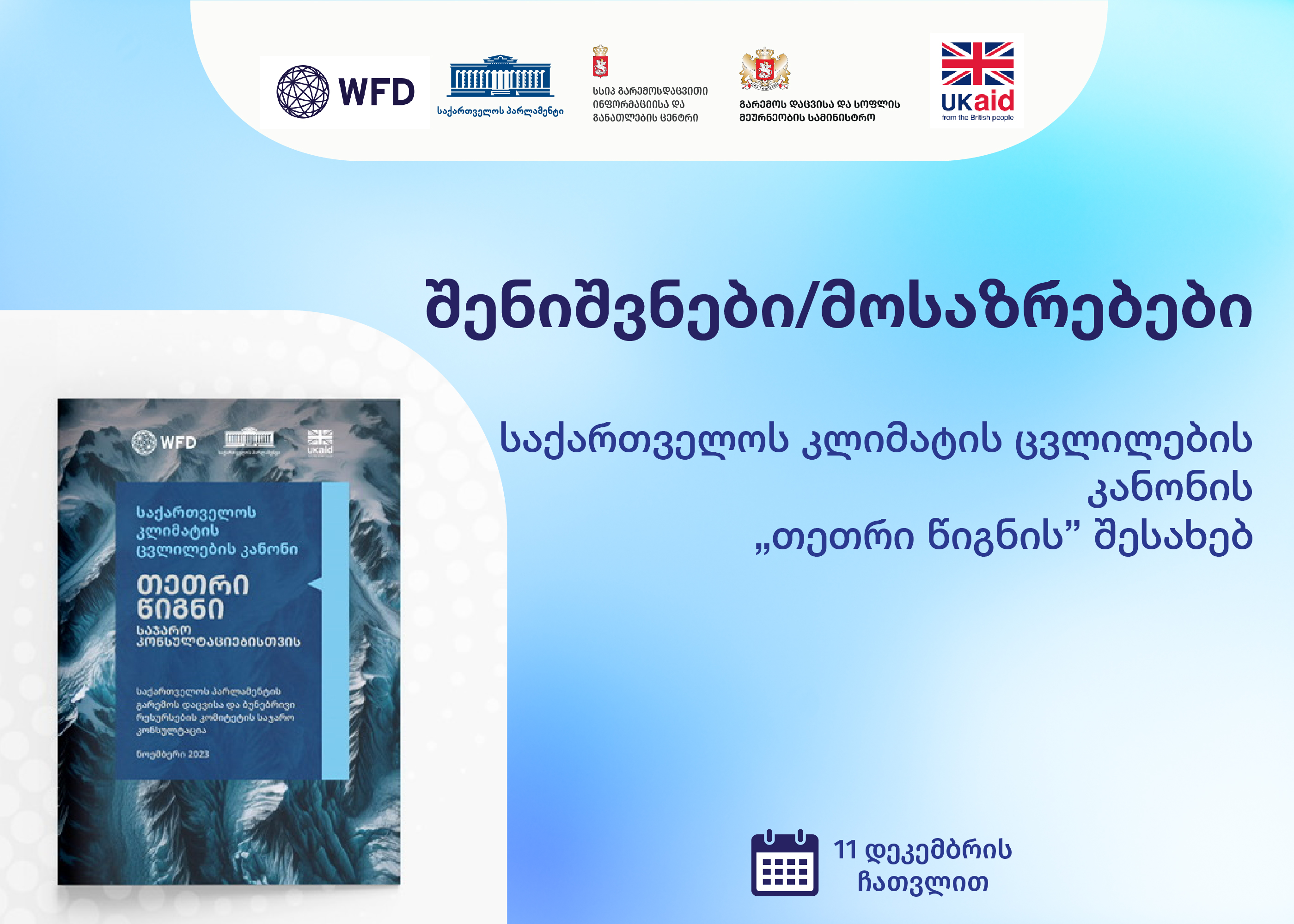 გიზიარებთ გარემოს დაცვისა და ბუნებრივი რესურსების კომიტეტის, ვესტმინსტერის დემოკრატიის ფონდისა (WFD) და გაერთიანებული სამეფოს მხარდაჭერით შემუშავებულ საკონსულტაციო დოკუმენტს - საქართველოს კლიმატის ცვლილების კანონის თეთრ წიგნს.