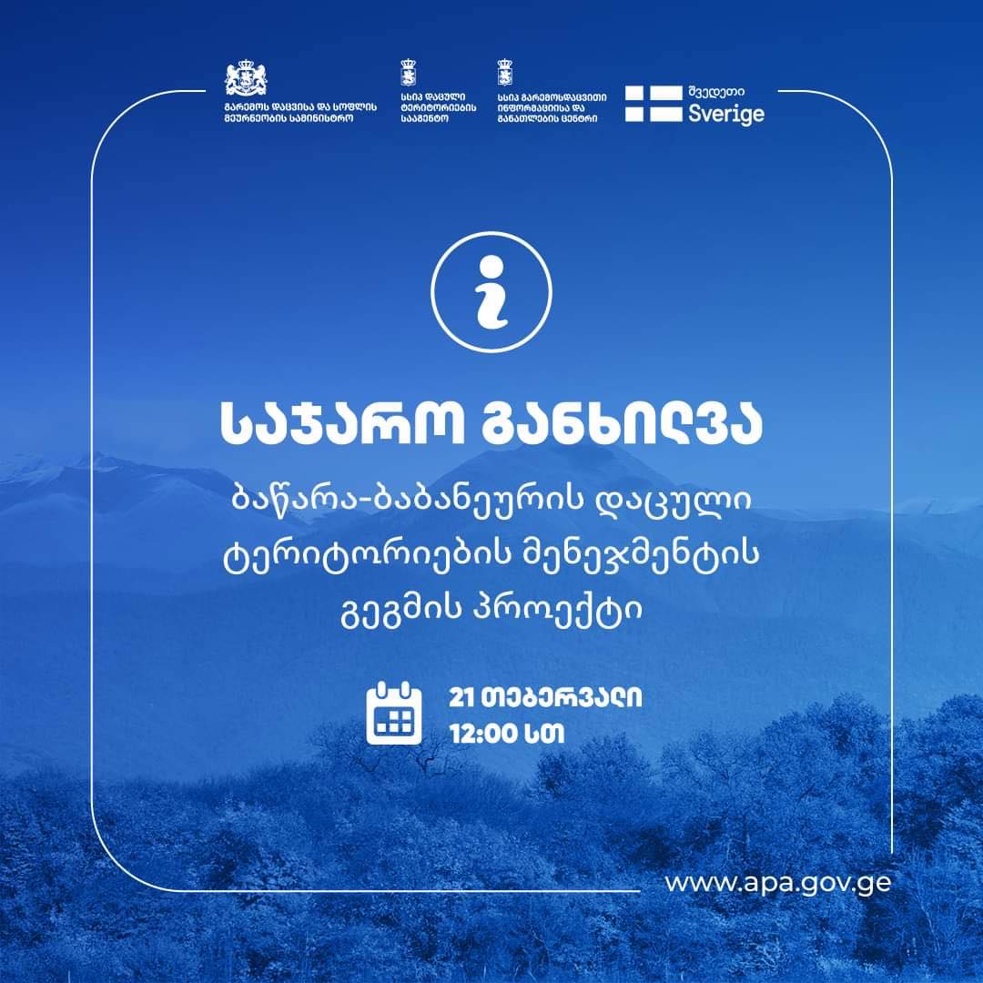 2024 წლის 21 თებერვალს, 12:00 საათზე, დაცული ტერიტორიების სააგენტოში (მის: ვლადიმერ წითლანაძის 1) ბაწარა-ბაბანეურის დაცული ტერიტორიების მენეჯმენტის გეგმის პროექტის საჯარო განხილვა გაიმართება.
