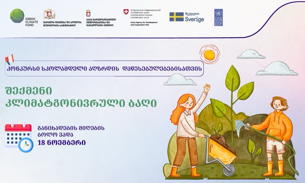 გარემოსდაცვითი ინფორმაციისა და განათლების ცენტრი აცხადებს კონკურსს სკოლამდელი აღზრდის დაწესებულებებისთვის. კონკურსი ცხადდება პროგრამის „კლიმატის ცვლილებით გამოწვეული კატასტროფების რისკის შემცირება საქართველოში“ ფარგლებში, რომელიც დაფინანსებულია საქართველოს მთავრობის, კლიმატის მწვანე ფონდის (GCF), შვეიცარიის და შვედეთის მთავრობის მიერ, მის განხორცილებას კი, გაეროს განვითარების პროგრამა (UNDP) უზრუნველყოფს.