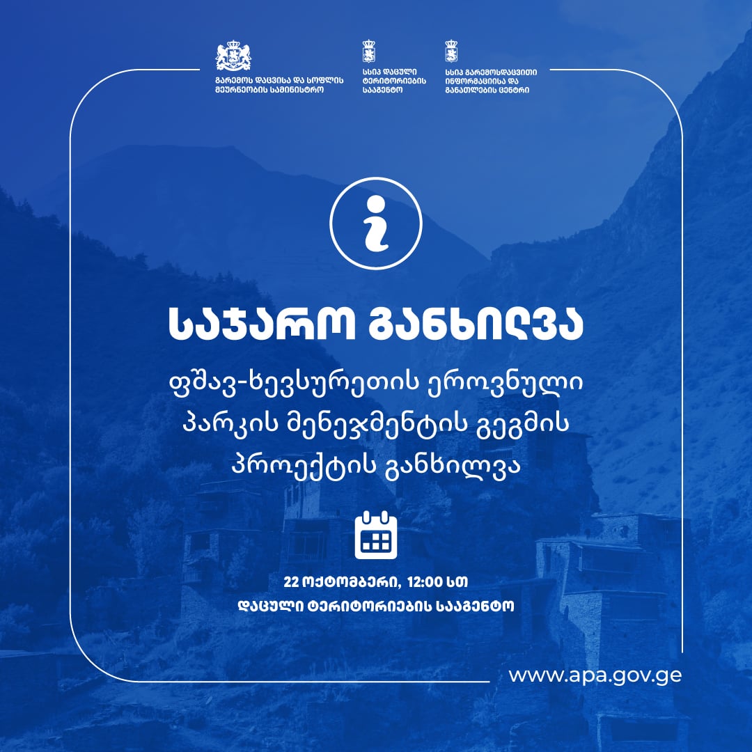 ფშავ-ხევსურეთის დაცული ტერიტორიების მენეჯმენტის გეგმის პროექტის საჯარო განხილვა დაცული ტერიტორიების სააგენტოში გაიმართება.
